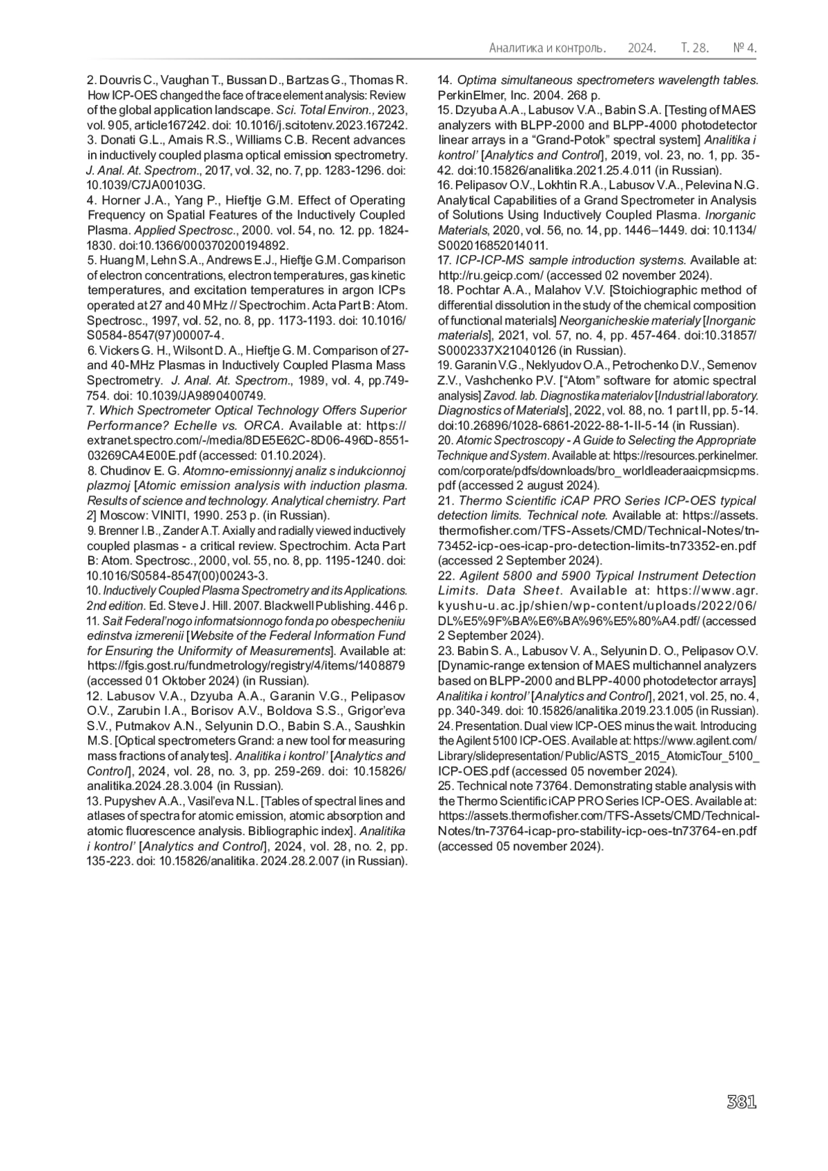 В 2024 году отмечается 50-летие создания первого коммерчески доступного атомно-эмиссионного спектрометра с аргоновой индуктивно связанной плазмой (ИСП). С тех пор метод атомно-эмиссионной спектрометрии с ИСП стал одним из наиболее широко используемых аналитических методов в мире. Для получения ИСП используют полупроводниковые или ламповые генераторы с частотой 27.12 или 40.68 МГц. Спектры излучения анализируемых растворов регистрируют с помощью спектральных приборов со скрещенной дисперсией (эшелле спектрометр) матричным детектором или с помощью приборов, построенных по схеме Пашена-Рунге, сборками линеек детекторов. Для решения задачи импортозамещения разработан и налажен серийный выпуск российского атомно-эмиссионного спектрометра Гранд-ИСП (№89108-23 в госреестре средств измерений РФ), ознакомление с характеристиками которого является целью данной работы. ИСП получена с помощью ВЧ генератора (40.68 МГц) с самовозбуждением, выполненного на основе генераторного триода. Плазма поддерживается в вертикально установленной трехпотоковой полуразборной кварцевой горелке. Спектральный прибор по схеме Пашена-Рунге регистрирует спектр одновременно в области от 160 до 780 нм с помощью линеек детекторов БЛПП-4000 с разрешением 15 пм в области 160-190 нм, 8 пм - 190-350 нм, 25 пм - 350-780 нм. Спектрометр реализует аксиальный, радиальный и двойной обзор плазмы. Спектрометр Гранд-ИСП по своим аналитическим характеристикам не уступает зарубежным аналогам: пределы обнаружения элементов (3σ) ≤ 1 мкг/л; долговременная стабильность аналитических сигналов характеризуется ОСКО (относительное стандартное отклонение) менее 2 % для аналитов и менее 1% для линий Ar; диапазон линейности градуировочных зависимостей более 106 при использовании двойного обзора плазмы и более 107 при использовании нескольких линий. Спектрометр Гранд-ИСП успешно апробирован сотрудниками лабораторий предприятий промышленности РФ и в научных институтах РАН.