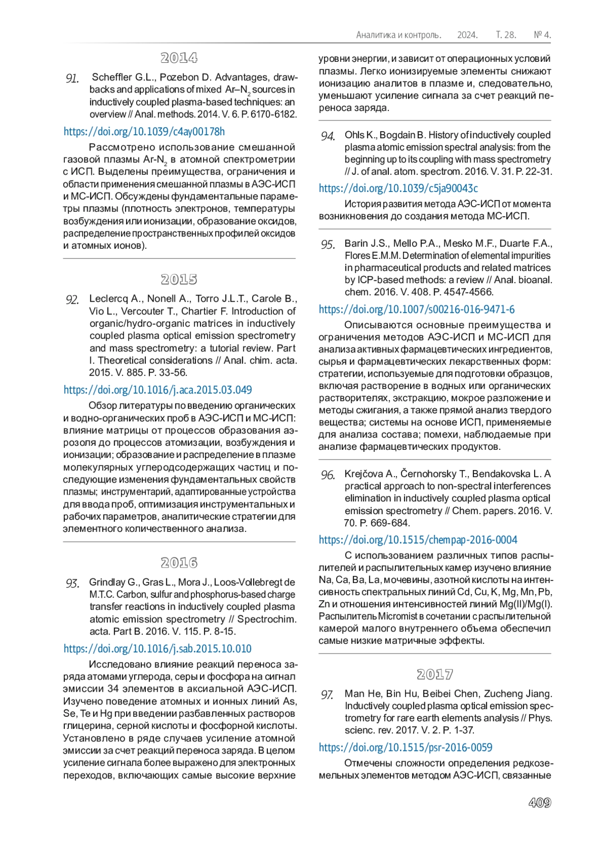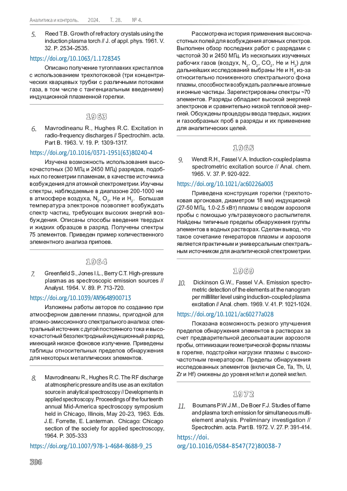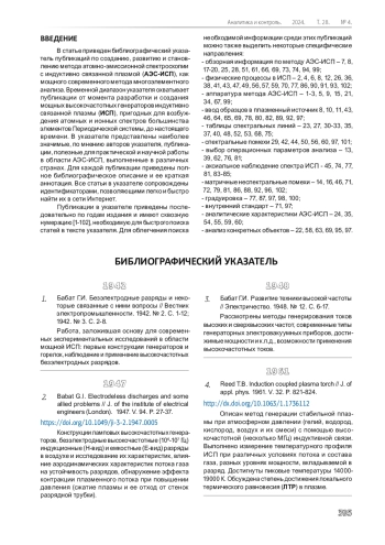 В статье приведен библиографический указатель публикаций по созданию, развитию и становлению метода атомно-эмиссионной спектроскопии с индуктивно связанной плазмой (АЭС-ИСП), как мощного современного метода многоэлементного анализа. Временной диапазон указателя охватывает публикации от момента разработки и создания мощных высокочастотных генераторов индуктивно связанной плазмы (ИСП), пригодных для возбуждения атомных и ионных спектров большинства элементов Периодической системы, до настоящего времени. В указателе представлены наиболее значимые, по мнению авторов указателя, публикации, полезные для практической и научной работы в области АЭС-ИСП, выполненные в различных странах. Для каждой публикации приведены полное библиографическое описание и ее краткая аннотация. Все статьи в указателе сопровождены идентификаторами, позволяющими легко и быстро найти их в сети Интернет.