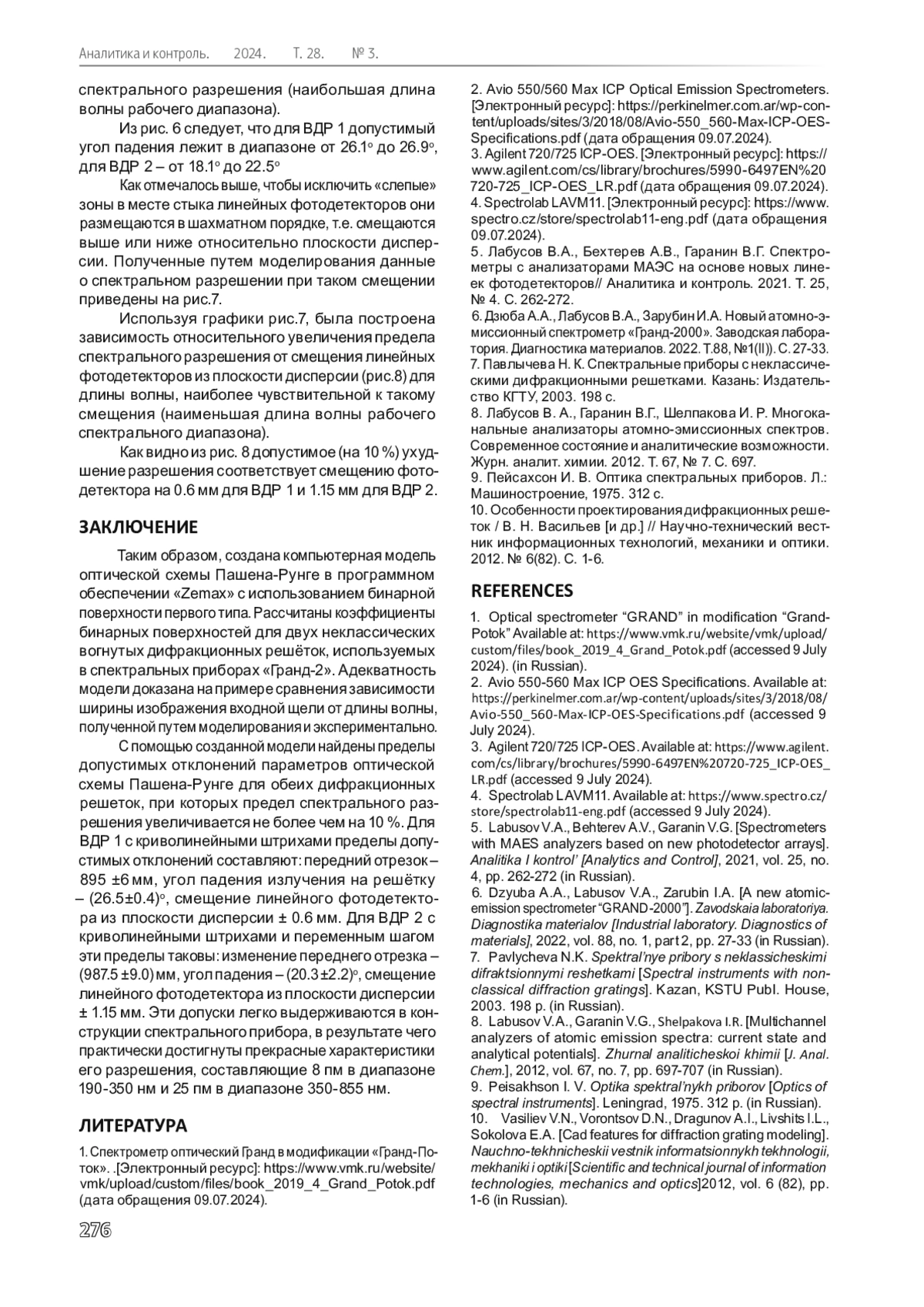 5. Лабусов В. А., Бехтерев А. В., Гаранин В. Г. Спектрометры с анализаторами МАЭС на основе новых линеек фотодетекторов // Аналитика и контроль. 2021. Т. 25, № 4. С. 262-272. EDN: WURMED