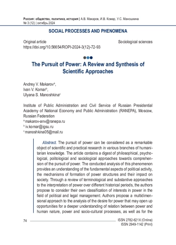 Стремление к власти представляет собой значимый объект научно-практического исследования в разных отраслях гуманитарного знания. В статье представлен обзор философских, психологических, политологических и социологических подходов относительно стремления к власти. Анализ стремления к власти обеспечивает понимание фундаментальных аспектов политической деятельности, механизмов формирования структур власти и их воздействия на общество. Через обзор терминологических и содержательных подходов к интерпретации власти на протяжении разных исторических периодов авторы предлагают к рассмотрению классификацию интересов к власти в сфере политико-правового управления. Авторы предлагают многоаспектный подход к анализу стремления к власти, что может открыть возможности для более глубокого понимания соотношения власти и человеческой природы, власти и социокультурных процессов, а также для разработки стратегий управления и развития, основанных на учете различных мотиваций и потребностей личности и общества.
