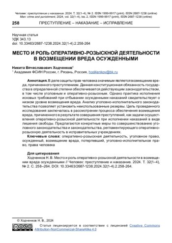 В деле защиты прав человека значимым является возмещение вреда, причиненного преступлением. Данная конституционная обязанность государства в определенной степени обеспечивается действующим законодательством, в том числе уголовным и оперативно-розыскным. Однако практика исполнения исковых требований при отбывании осужденными наказаний свидетельствует о низком уровне возмещения вреда. Анализ уголовно-исполнительного законодательства позволяет установить неиспользованные резервы. Цель проведенного исследования заключалась в рассмотрении процесса обеспечения возмещения вреда, причиненного в результате совершения преступлений, как задачи осуществления оперативно-розыскной деятельности при исполнении наказаний в виде лишения свободы. Предлагаются конкретные меры по совершенствованию уголовного законодательства и законодательства, регламентирующего оперативно-розыскную деятельность в исправительных учреждениях.