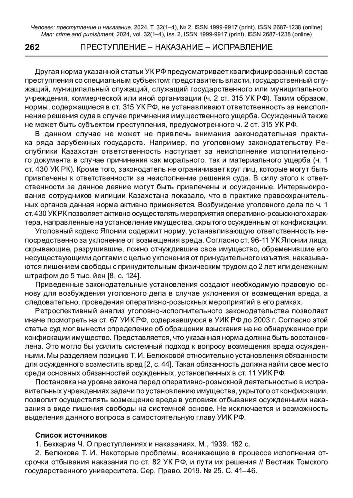2. Белюкова Т. И. Некоторые проблемы, возникающие в процессе исполнения отсрочки отбывания наказания по ст. 82 УК РФ, и пути их решения // Вестник Томского государственного университета. Сер. Право. 2019. № 25. С. 41-46.