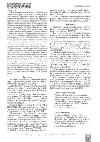 Предложенное исследование посвящено понятию «экологические поселения» и их философскому содержанию, что выражено в практической деятельности альтернативных сообществ. Особое внимание в статье уделено модели «циркулярной экономики», приведены примеры ее функционирования в мире, в том числе и в российском опыте. Изучена философия пермакультуры, как уникальный опыт, возникший еще в период Античности. Проанализирована основа социальных взаимоотношений в системе экологических населенных пунктов - теория социократии, призванная создавать чувство коллективного единства. Исследовано мировоззрение философии упрощения, а также подход к потреблению в устоявшихся экосообществах, характеризующихся сознательным минимумом и отказом от всего лишнего.