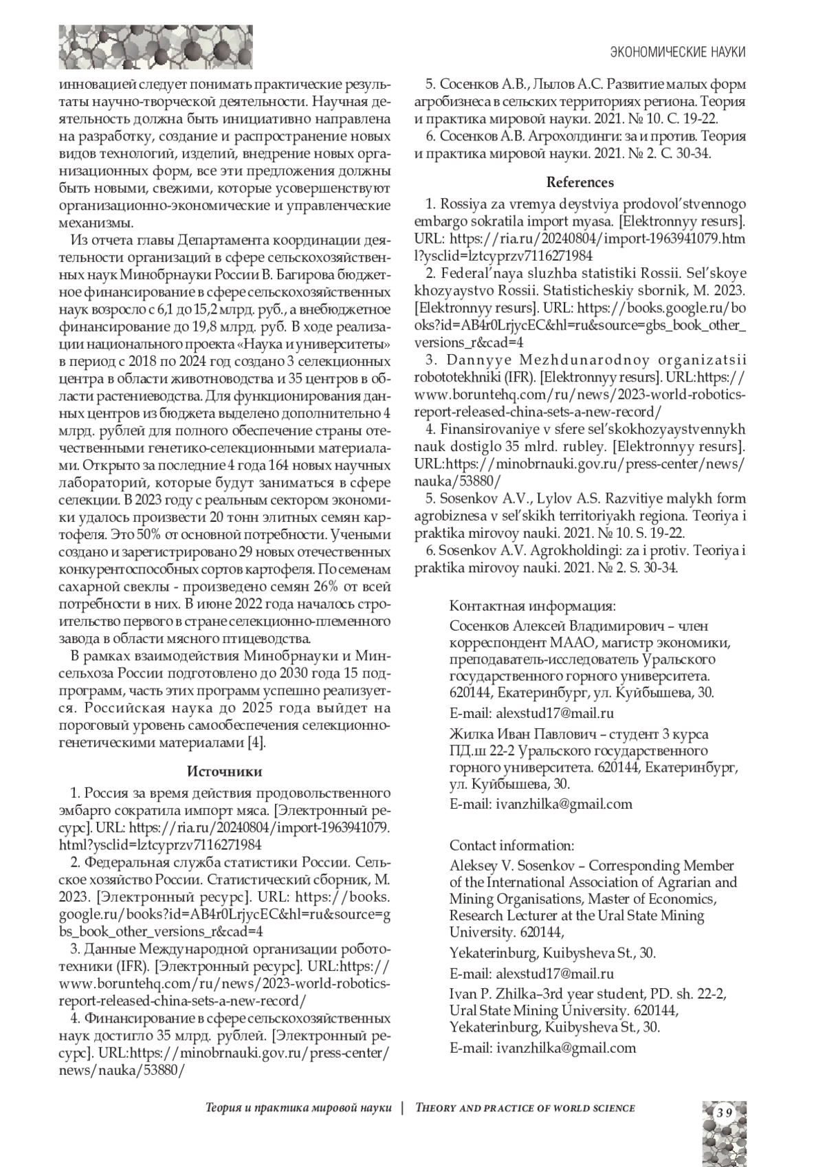 5. Сосенков А.В., Лылов А.С. Развитие малых форм агробизнеса в сельских территориях региона. Теория и практика мировой науки. 2021. № 10. С. 19-22. EDN: MBBPIM