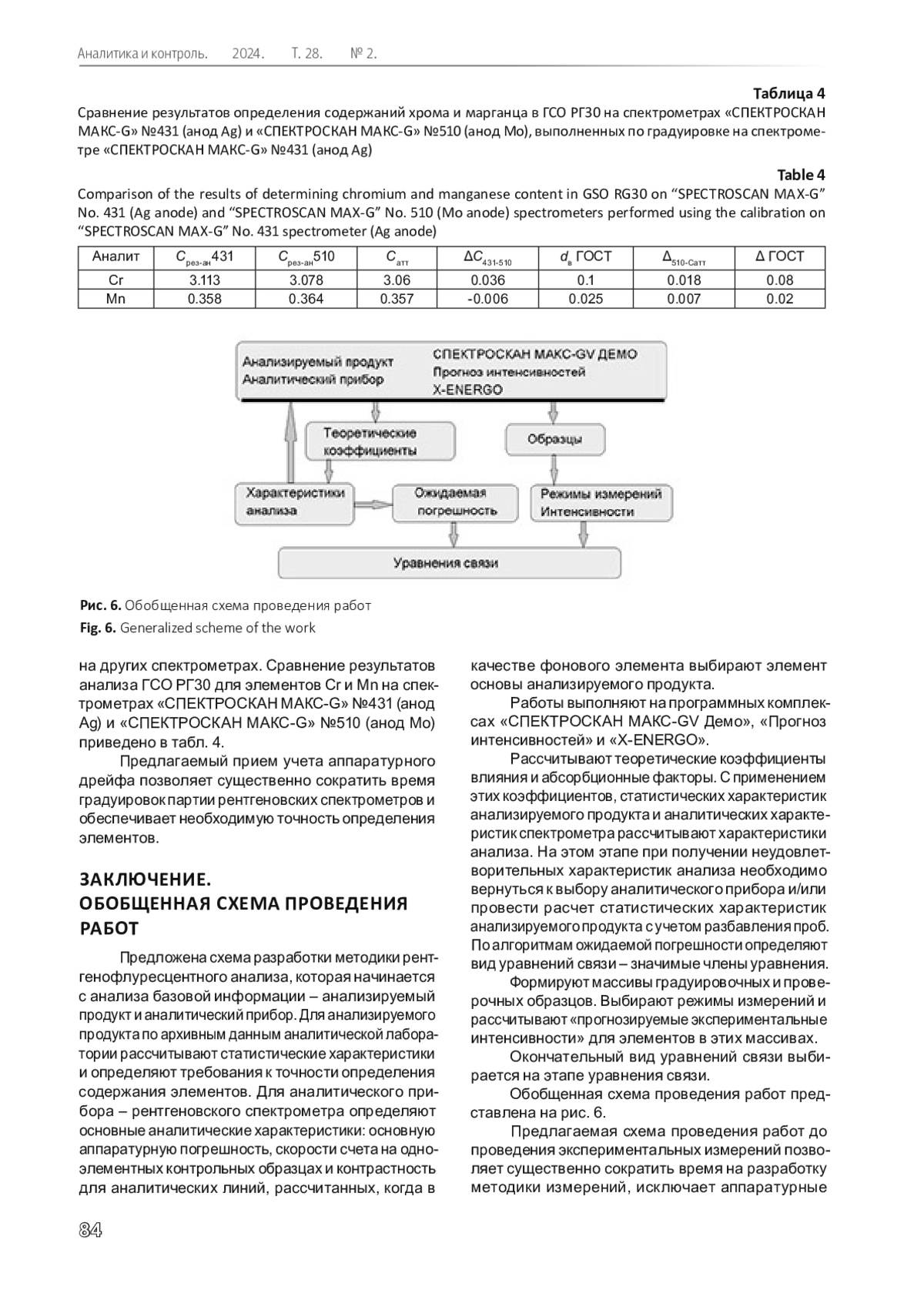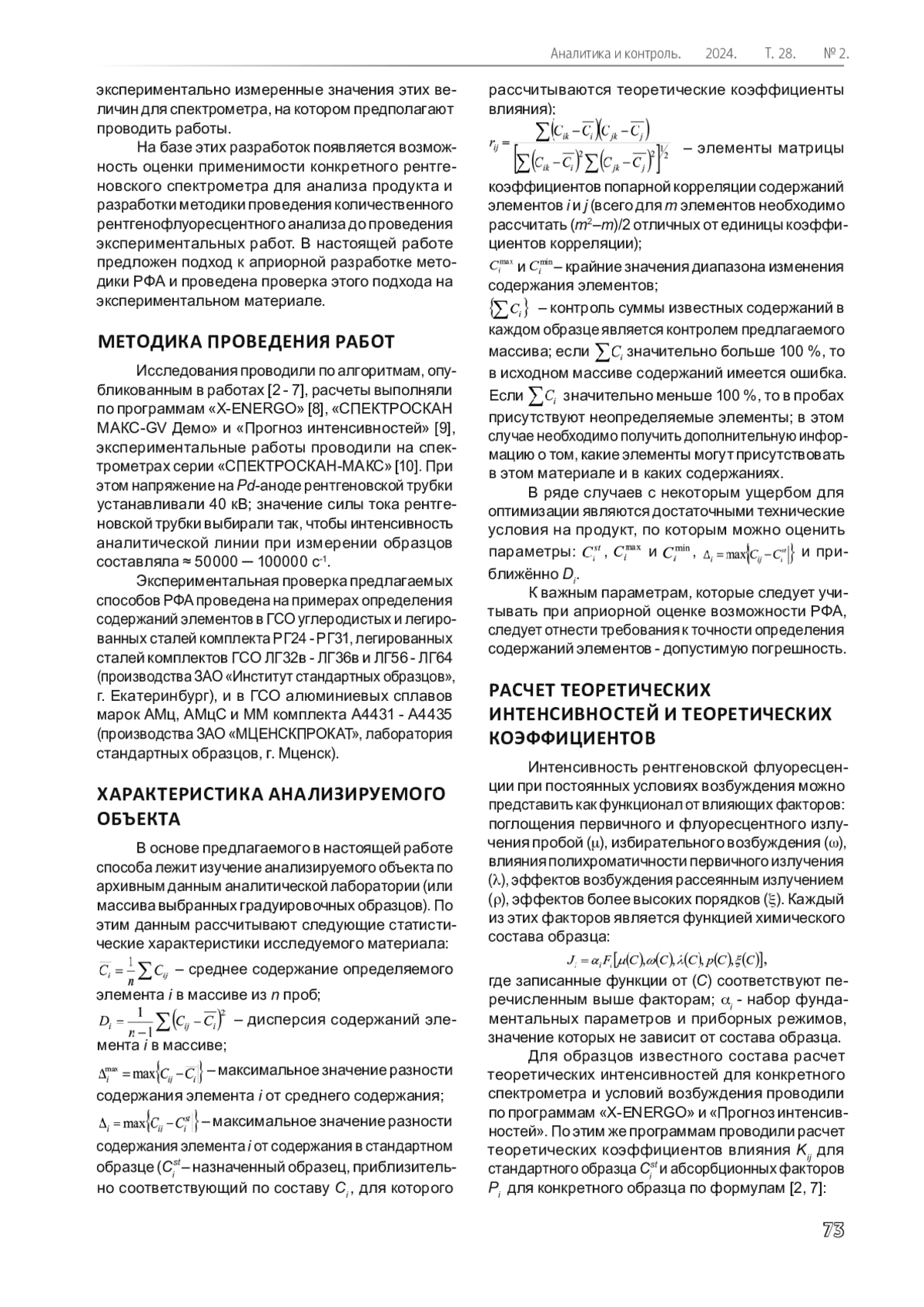 В представленной статье предлагается подход к разработке методики рентгенофлуоресцентного анализа объекта с применением кристалл-дифракционных спектрометров до проведения экспериментальных работ. Если методика рентгенофлуоресцентного анализа предназначена для замены существующей, то для анализируемого объекта по архивным данным аналитической лаборатории (или массива выбранных градуировочных образцов) рассчитывают статистические характеристики материала, для которого разрабатывают методику рентгенофлуоресцентного анализа: средние содержания определяемых элементов, дисперсия и диапазон содержаний элементов, а также требования к точности определения элементов и некоторые другие. В случае создания новой методики достаточным являются технические условия на продукт, по которым эти характеристики могут быть оценены. Для применяемого спектрометра должны быть измерены и рассчитаны аналитические характеристики во всем рабочем диапазоне измеряемых аналитических линий: основная аппаратурная погрешность, чувствительность, спектральное разрешение, контрастность. На основе этих данных оценивают метрологические характеристики методики определения элементов: предел обнаружения, дифференциальную чувствительность, инструментальную воспроизводимость измерения содержаний при выбранном времени экспозиции. На этом этапе может быть решен вопрос о необходимости разбавления проб тяжелым или легким разбавителем для получения удовлетворительной дифференциальной чувствительности. Для определяемых элементов определяют режимы регистрации аналитического сигнала: аналитические линии, кристаллы-анализаторы, режимы работы рентгеновской трубки, оценивают вероятность наложения спектральных линий, проводят выбор точек измерения фона. Проводят расчет теоретических и моделирование экспериментальных интенсивностей для выбранных градуировочных и проверочных образцов и расчет теоретических коэффициентов влияния. По статистическим характеристикам материала и теоретическим коэффициентам влияния оценивают ожидаемую погрешность анализа и определяют необходимость учета в уравнениях связи влияющих элементов для получения требуемой точности определения элементов. По смоделированным экспериментальным интенсивностям аналитических линий элементов проводят выбор регрессионных или теоретических уравнения связи, обеспечивающих требуемую точность определения элементов. Такой подход позволяет априорно оценить возможность разработки методики рентгено- флуоресцентного анализа выбранного объекта и значительно сократить время для проведения экспериментальных работ.