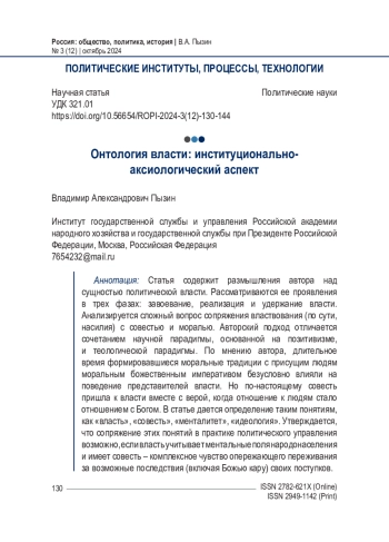 Статья содержит размышления автора над сущностью политической власти. Рассматриваются ее проявления в трех фазах: завоевание, реализация и удержание власти. Анализируется сложный вопрос сопряжения властвования (по сути, насилия) с совестью и моралью. Авторский подход отличается сочетанием научной парадигмы, основанной на позитивизме, и теологической парадигмы. По мнению автора, длительное время формировавшиеся моральные традиции с присущим людям моральным божественным императивом безусловно влияли на поведение представителей власти. Но по-настоящему совесть пришла к власти вместе с верой, когда отношение к людям стало отношением с Богом. В статье дается определение таким понятиям, как «власть», «совесть», «менталитет», «идеология». Утверждается, что сопряжение этих понятий в практике политического управления возможно, если власть учитывает ментальные поля народонаселения и имеет совесть – комплексное чувство опережающего переживания за возможные последствия (включая Божью кару) своих поступков.