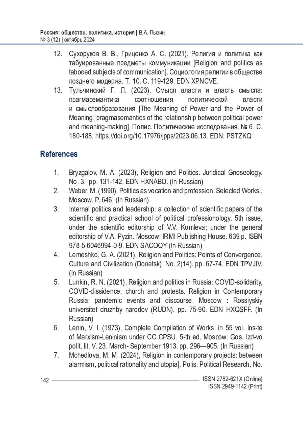12. Сухоруков В. В., Гриценко А. С. (2021), Религия и политика как табуированные предметы коммуникации [Religion and politics as tabooed subjects of communication]. Социология религии в обществе позднего модерна. Т. 10. С. 119-129. EDN XPNCVE.