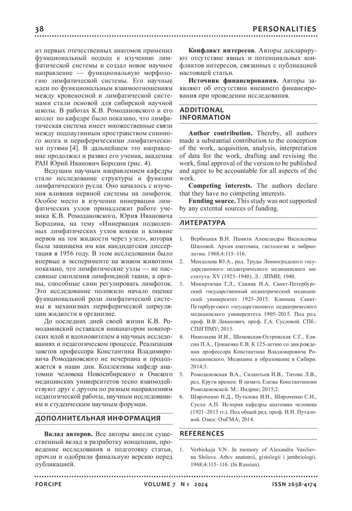 Данная статья посвящена 135-летию со дня рождения Константина Владимировича Ромодановского — выдающегося отечественного ученого-анатома, прекрасного педагога, основоположника сибирской школы лимфологов. В Омске К. В. Ромодановский (1921–1931) стал одним из первых анатомов, заложивших основы функционального подхода к изучению строения тела человека с привлечением онто- и филогенетических принципов для объяснения многих закономерностей его построения. Особая заслуга коллектива кафедры анатомии, руководимой профессором К. В. Ромодановским, состояла в создании первоначально учебного, а затем фундаментального анатомического музея. В 1931 году К. В. Ромодановский был переведен в Ленинград для участия в организации Медвуза-больницы, которая позднее была преобразована в Ленинградский педиатрический институт (ныне — Санкт-Петербургский государственный педиатрический медицинский университет). В 1932 году он был избран заведующим кафедрой нормальной анатомии этого института. Основой педагогической установки являлось преподавание с учетом возрастных особенностей детского организма, в тесной связи института с клиникой. Большое внимание уделялось рентгеноанатомии. В 1948 году Константин Владимирович был назначен заведующим кафедрой нормальной анатомии Новосибирского государственного медицинского института (ныне Новосибирского государственного медицинского университета). С этого момента начался настоящий расцвет научной и педагогической деятельности профессора К. В. Ромодановского. С его приходом характер учебно-методической работы кафедры приобрел ярко выраженную научную основу. Он одним из первых отечественных анатомов внедрил в морфологическую практику эксперимент на животных, применил функциональный подход к изучению лимфатической системы и создал новое научное направление — функциональную морфологию лимфатической системы.