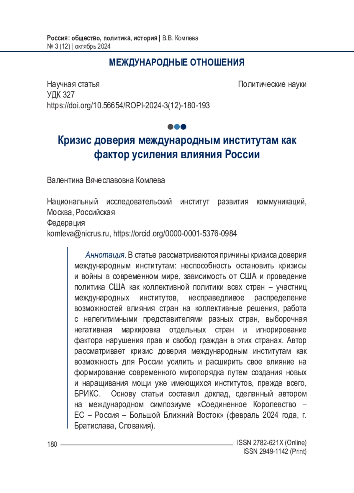 В статье рассматриваются причины кризиса доверия международным институтам: неспособность остановить кризисы и войны в современном мире, зависимость от США и проведение политика США как коллективной политики всех стран – участниц международных институтов, несправедливое распределение возможностей влияния стран на коллективные решения, работа с нелегитимными представителями разных стран, выборочная негативная маркировка отдельных стран и игнорирование фактора нарушения прав и свобод граждан в этих странах. Автор рассматривает кризис доверия международным институтам как возможность для России усилить и расширить свое влияние на формирование современного миропорядка путем создания новых и наращивания мощи уже имеющихся институтов, прежде всего, БРИКС. Основу статьи составил доклад, сделанный автором на международном симпозиуме «Соединенное Королевство – ЕС – Россия – Большой Ближний Восток» (февраль 2024 года, г. Братислава, Словакия).