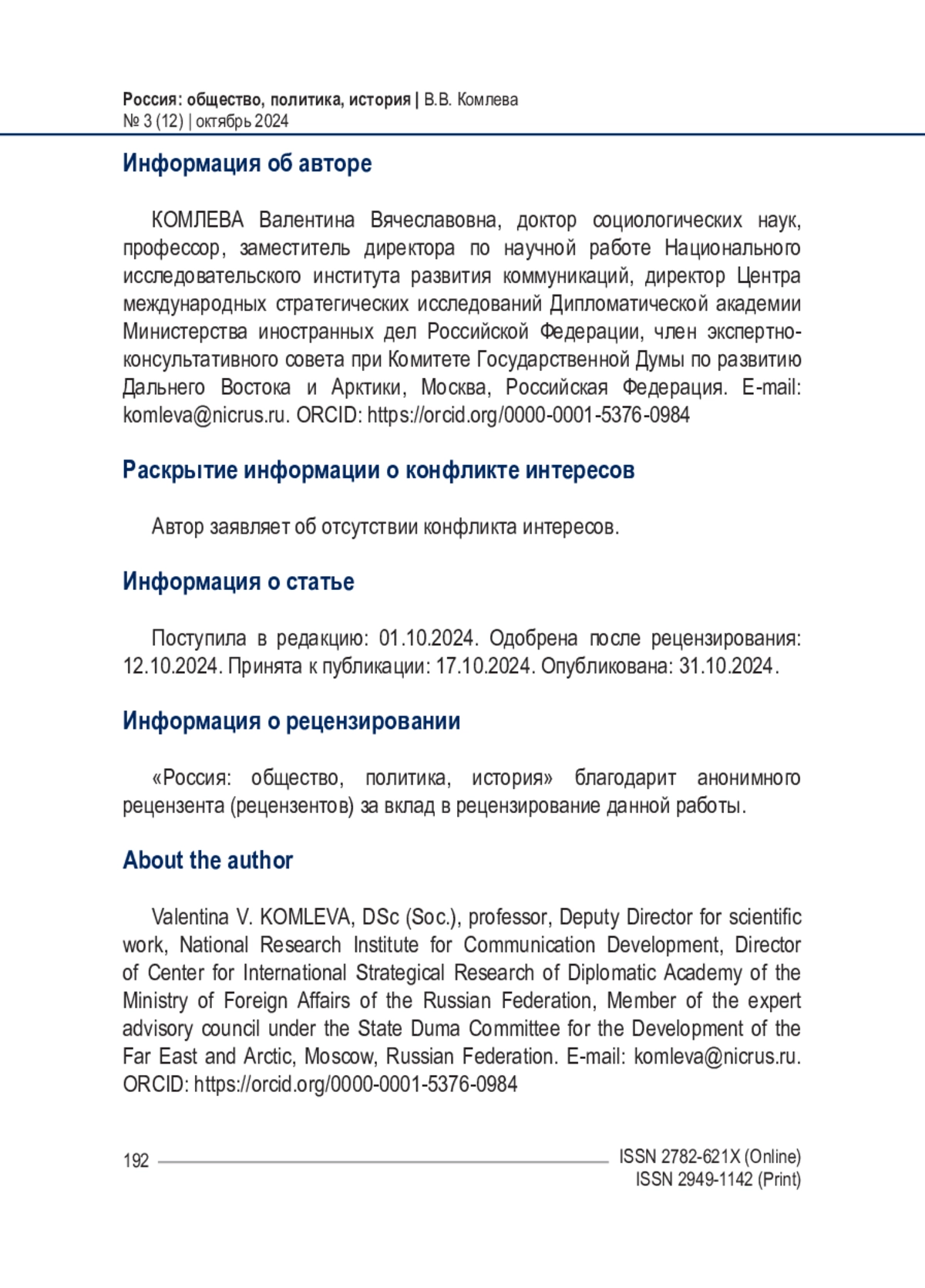Статья представляет собой вступительное слово главного редактора журнала “Россия: общество, политика, история” Комлевой Валентины Вячеславовны