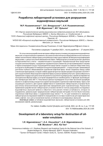 В статье описана разработанная авторами лабораторная установка для разрушения водонефтяных эмульсий, которую возможно применять как новое вспомогательное оборудование в испытательных химико-аналитических лабораториях для пробоподготовки cырых нефтей, являющихся водонефтяными эмульсиями, с целью получения обезвоженной нефти. Лабораторная установка включает два блока из боросиликатного стекла - нагревательный и осушающий. Нагревательный блок представлен сосудом конической формы, оснащенным нагревательным элементом для программируемого нагрева и термостатирования сосуда. Осушающий блок представлен сосудом со сливным отверстием снизу, в который по необходимости помещается водопоглощающий реагент - хлорид кальция, применяемый для более глубокого обезвоживания отделённой нефтяной фазы. Блоки соединены между собой стеклянным переходником, который снабжен двумя фторопластовыми кранами или кранами типа КхН-1 для осуществления сбора водной и нефтяной фазы в разные приемные бутыли. Целесообразность применения хлорида кальция в качестве реагента осушителя подтверждалась серией экспериментов на модельном образце нефти, в котором предварительно освобождались от фракций, выкипающих при температуре ниже 300 °С. Полученные данные подтвердили отсутствие частичной адсорбции смолисто-асфальтеновых веществ во время прохождения отделенной нефтяной фазы через слой осушающего реагента. Для оценки эффективности применения лабораторной установки были рассчитаны метрологические характеристики определения доли отделенной воды. Результатом применения разработанной лабораторной установки является полное разрушение исследуемых водонефтяных эмульсий прямого и обратного типа разной степени устойчивости, которые не поддавались деэмульсации традиционными лабораторными методами. В итоге были получены отделенные нефтяные фазы с содержанием воды менее 1 %, что дает возможность проводить лабораторные исследования нефтей по определению их состава и свойств как для характеристики самих нефтей, так и для установления причин устойчивости анализируемых эмульсий.