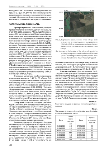 Предложен способ определения 2,4-дихлорфеноксиуксусной кислоты (2,4-Д) и ее метаболита - 2,4-дихлорфенола (2,4-ДХФ) в почвах. 2,4-Д и 2,4ДХФ из почвы выделяли экстракцией раствором щелочи. Из экстракта аналиты извлекали с помощью сорбента на основе наночастиц магнетита и угля, полученного сжиганием рисовой шелухи, и десорбировали метанолом. В полученном концентрате 2,4-Д и 2,4-ДХФ переводили в метиловые эфиры и определяли их методом ГХ-МС. Пределы обнаружения 2,4-Д и 2,4-ДХФ составили соответственно 3.0 и 0.08 мкг/кг. В качестве реального объекта для анализа распределения гербицида «Балерина» (этилгексиловый эфир 2,4-Д) и его продукта деградации выбран выщелоченный чернозем (граница Ставропольского и Краснодарского краев). Через день после внесения препарата концентрация 2,4-Д в поверхностном слое почвы составила 119 мкг/кг. Существенное влияние на продвижение 2,4-Д по почвенному профилю оказывает выпадение осадков. Наибольшее снижение концентрации 2,4-Д установлено между 3 и 10 днями после внесения препарата. Через месяц после применения гербицида концентрации 2,4-Д составили 31, 18 и 11 мкг/кг на глубинах 10, 30 и 50 см соответственно, в поверхностном слое почвы 2,4-Д не обнаружен. 2,4-ДХФ в детектируемых количествах присутствовал на 16 день после применения гербицида, его деградация протекает значительно медленнее 2,4-Д. Через 1.5 месяца концентрация 2,4-ДХФ составила 0.53, 0.45 и 0.22 мкг/кг на глубинах 10, 30 и 50 см соответственно. В этот же срок 2,4-Д по всему почвенному профилю не обнаружен.