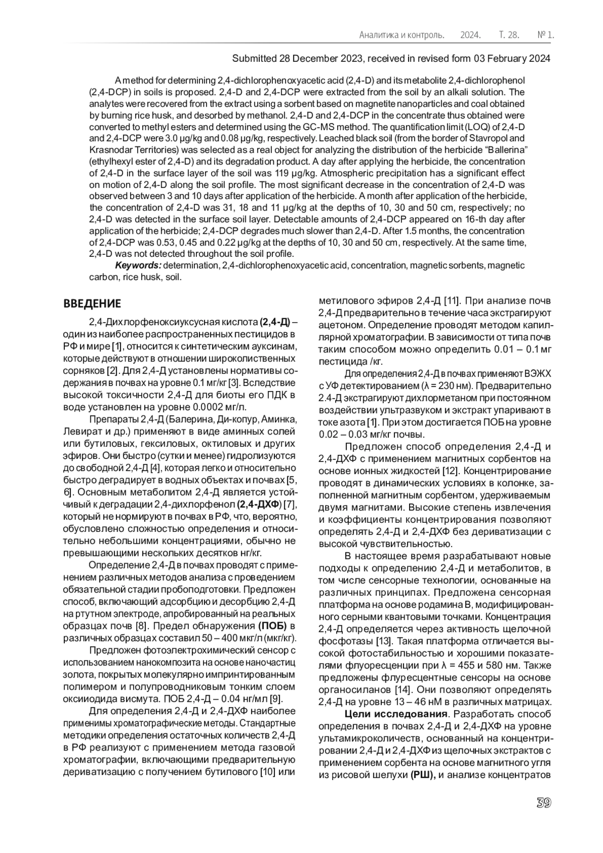 2,4-Дихлорфеноксиуксусная кислота (2,4-Д) – один из наиболее распространенных пестицидов в РФ и мире [1], относится к синтетическим ауксинам, которые действуют в отношении широколиственных сорняков [2]. Для 2,4-Д установлены нормативы содержания в почвах на уровне 0.1 мг/кг [3]. Вследствие высокой токсичности 2,4-Д для биоты его ПДК в воде установлен на уровне 0.0002 мг/л.