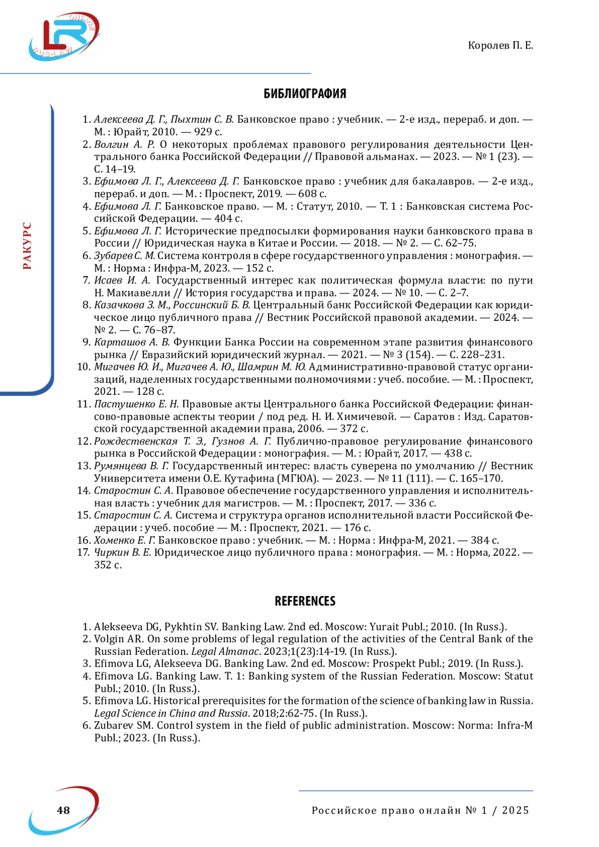 2. Волгин А. Р. О некоторых проблемах правового регулирования деятельности Центрального банка Российской Федерации // Правовой альманах. - 2023. - № 1 (23). - С. 14-19.