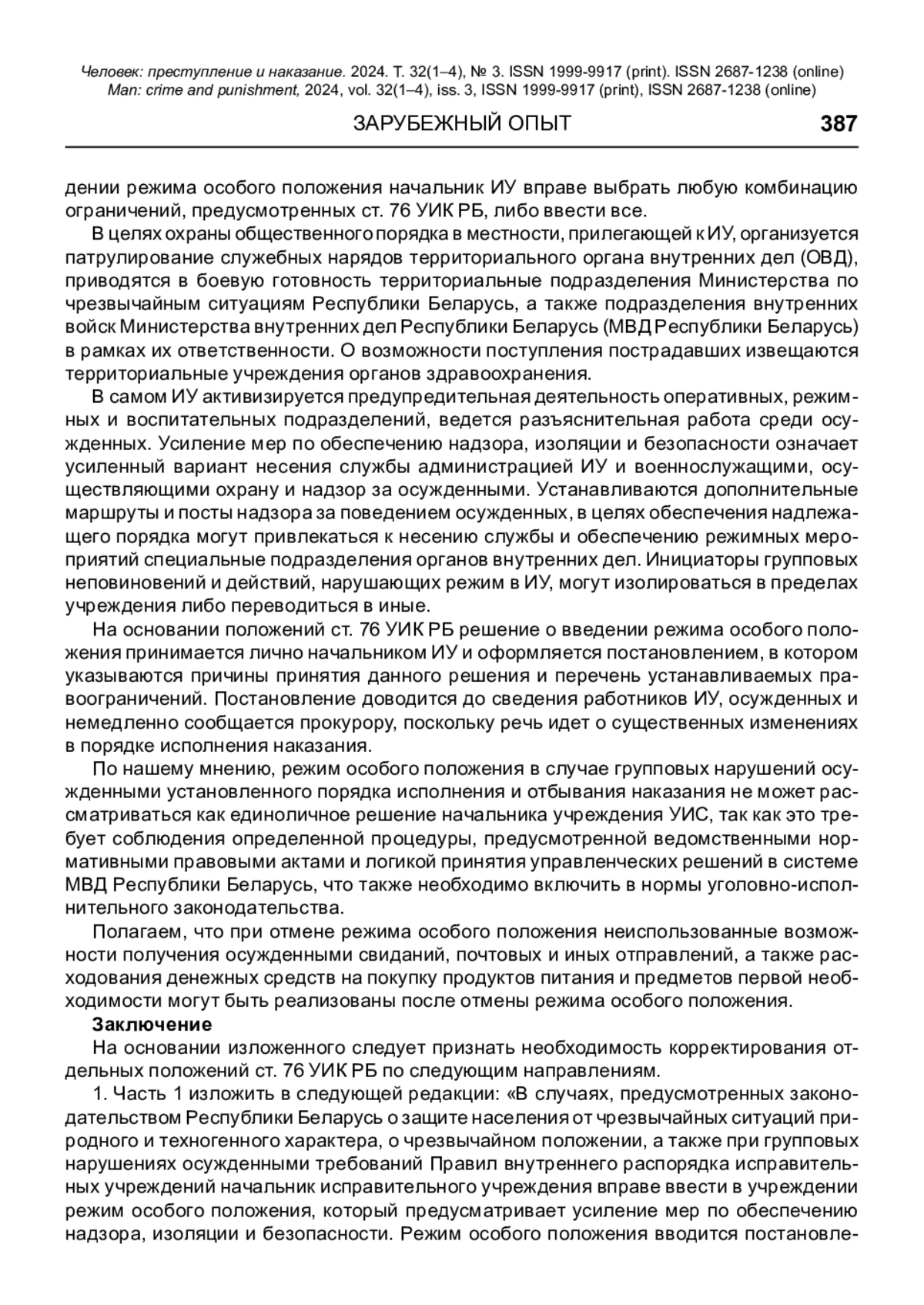 В статье исследуются проблемы правового регулирования деятельности учреждений уголовно-исполнительной системы при возникновении чрезвычайных ситуаций антропогенного, технологического и природного характера, влияющих на процесс исполнения наказания. Сформулированы актуальные предложения по совершенствованию статьи 76 Уголовно-исполнительного кодекса Республики Беларусь, регламентирующей отношения, возникающие при введении режима особого положения в исправительном учреждении.