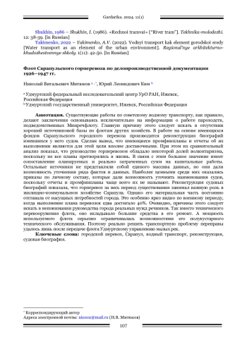 Существующие работы по советскому водному транспорту, как правило, делают заключения основываясь исключительно на информации о работе пароходств, подведомственных Минречфлоту. Главную причину этого следует искать в отсутствии хорошей источниковой базы по флотам других хозяйств. В работе на основе имеющихся фондов Сарапульского городского перевоза производится реконструкция биографий имевшихся у него судов. Сделан вывод, что имеющиеся промфинпланы и отчеты об их выполнении являются для этой цели вполне доставочными. При этом их сравнительный анализ показал, что руководство горперевозом обладало некоторой долей волюнтаризма, поскольку не все планы претворялись в жизнь. В связи с этим большое значение имеет сопоставление планируемых и реально затраченных сумм на капитальные работы. Остальные источники не представляли собой единого массива данных, но они дали возможность уточнения ряда фактов и данных. Наиболее ценными среди них оказались приказы по личному составу, которые дали возможность уточнить наименования судов, поскольку отчеты и промфинпланы чаще всего их не называют. Реконструкция судовых биографий показала, что горперевоз за весь период существования занимал важную роль в жилищно-коммунальном хозяйстве Сарапула. Однако его материальная часть постоянно отставала от насущных потребностей города. Это особенно ярко видно по военному периоду, когда выполнение плана перевозок едва достигало 40%. Очевидно, причины этого следует искать в непонимании руководства города реальных нужд речников. Так вместо технического перевооружения флота, оно вкладывало большие средства в его ремонт. А мощность используемого флота серьезно ограничивалась возможностями его полукустарного технического обслуживания. Поэтому реально решить транспортную проблему переправы удалось лишь после передаче флота Удмуртскому управлению малых рек.