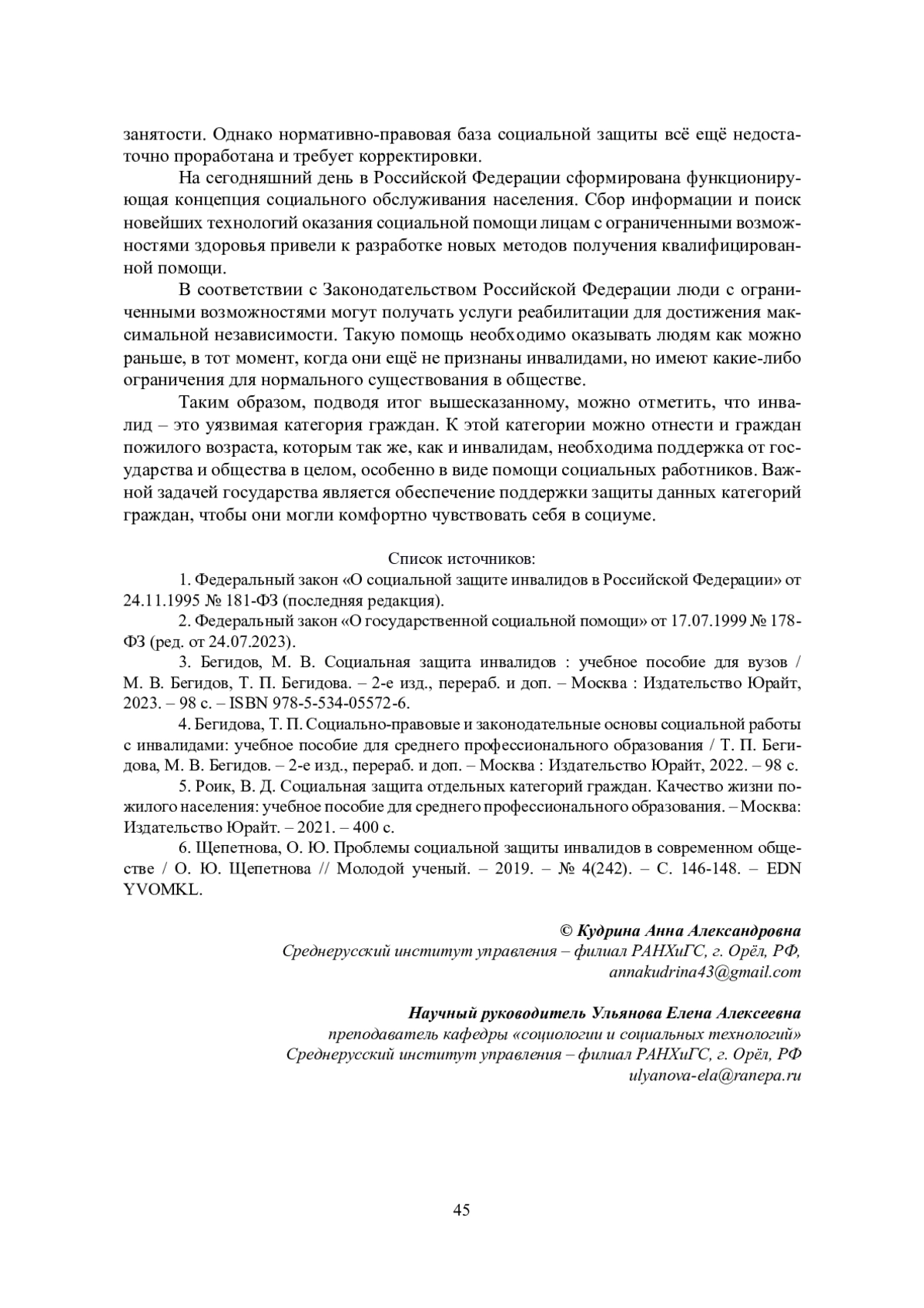 3. Бегидов, М. В. Социальная защита инвалидов: учебное пособие для вузов / М. В. Бегидов, Т. П. Бегидова. - 2-е изд., перераб. и доп. - Москва: Издательство Юрайт, 2023. - 98 с. ISBN: 978-5-534-05572-6