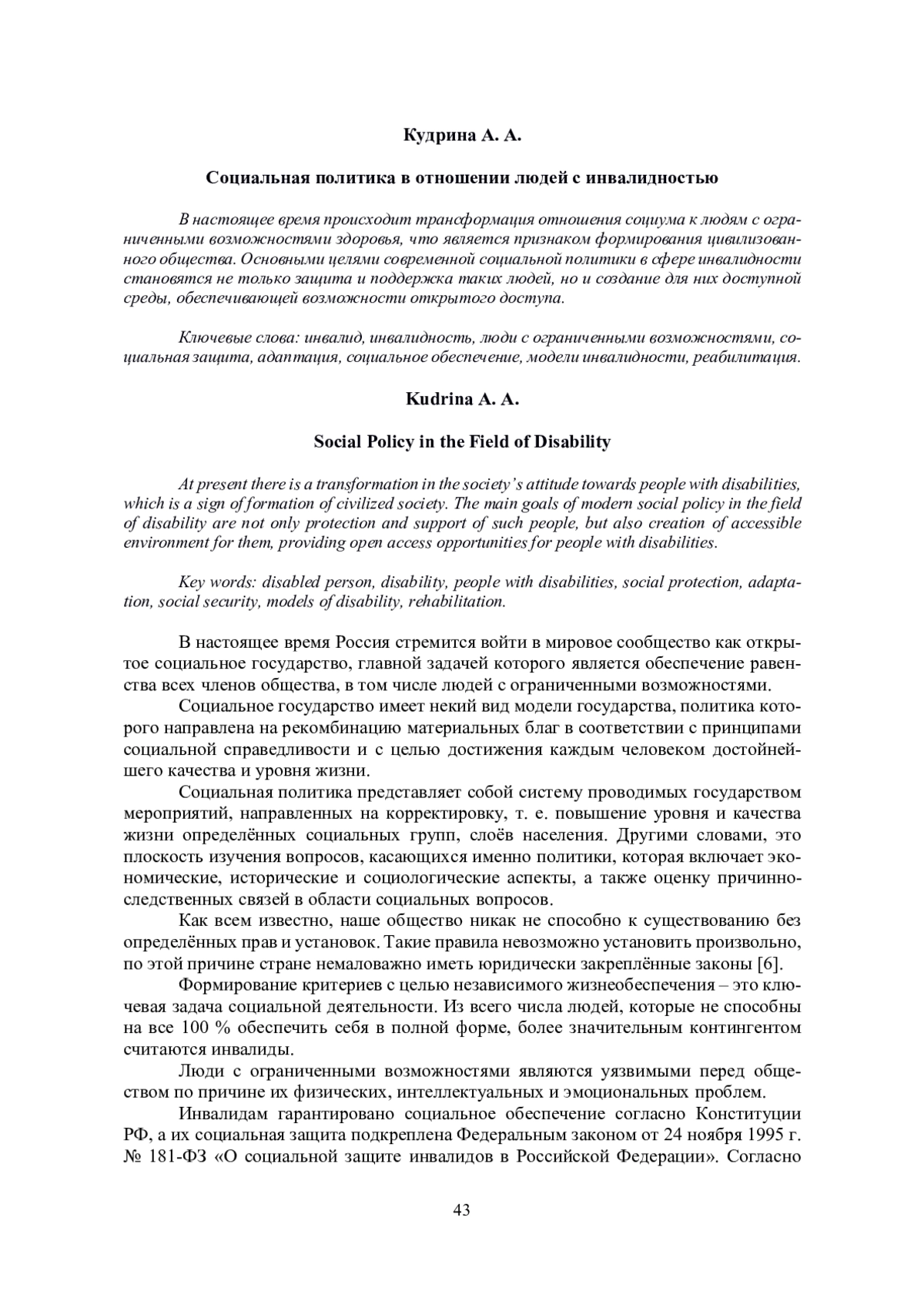 В настоящее время Россия стремится войти в мировое сообщество как открытое социальное государство, главной задачей которого является обеспечение равенства всех членов общества, в том числе людей с ограниченными возможностями.
