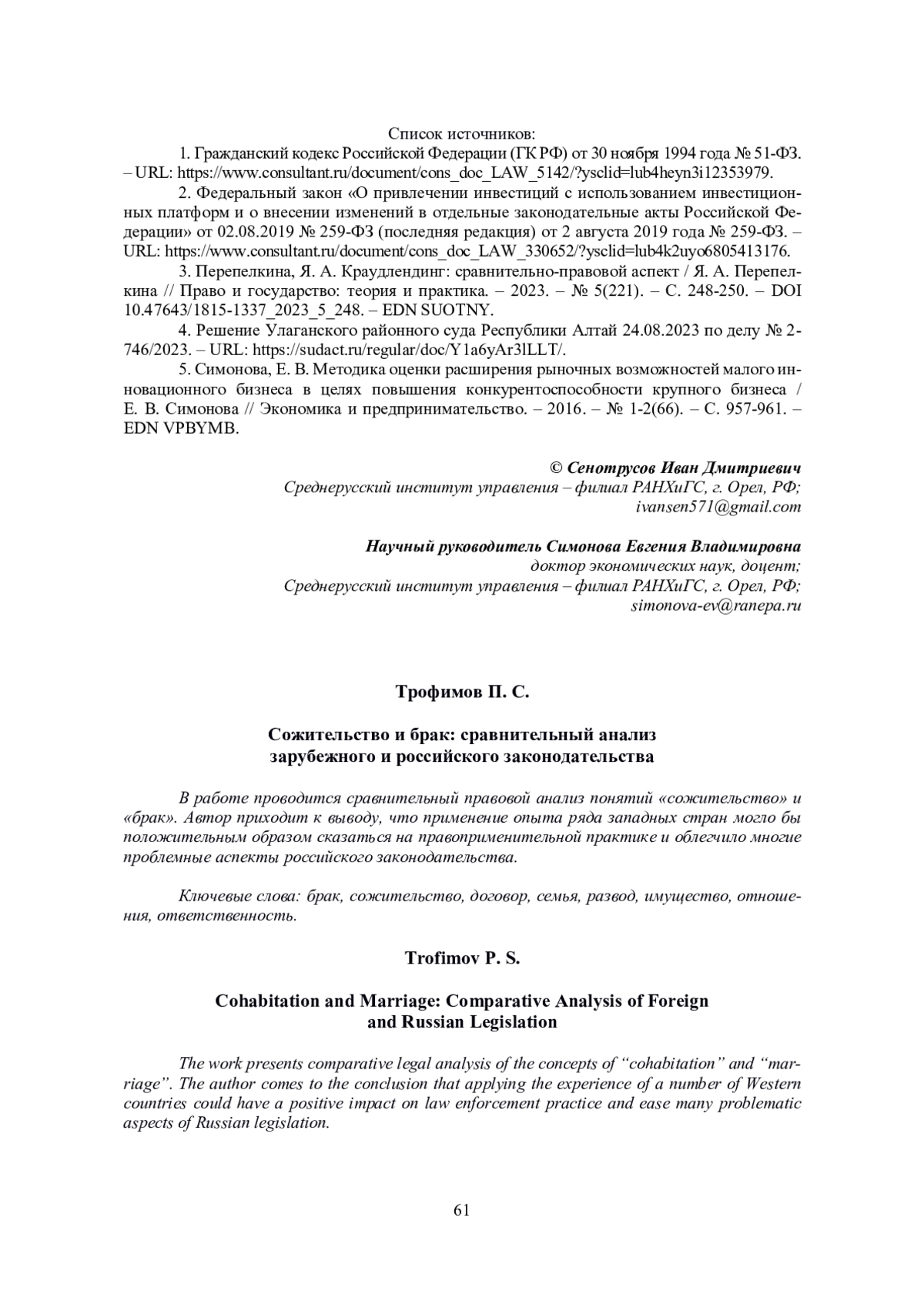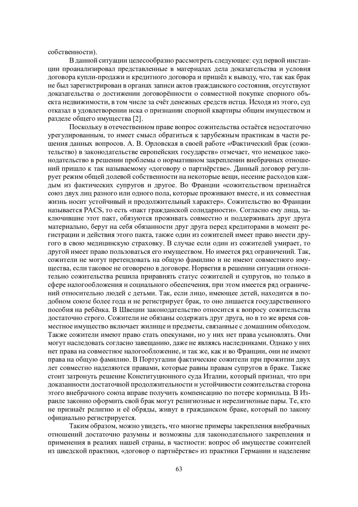 В работе проводится сравнительный правовой анализ понятий «сожительство» и «брак». Автор приходит к выводу, что применение опыта ряда западных стран могло бы положительным образом сказаться на правоприменительной практике и облегчило многие проблемные аспекты российского законодательства.