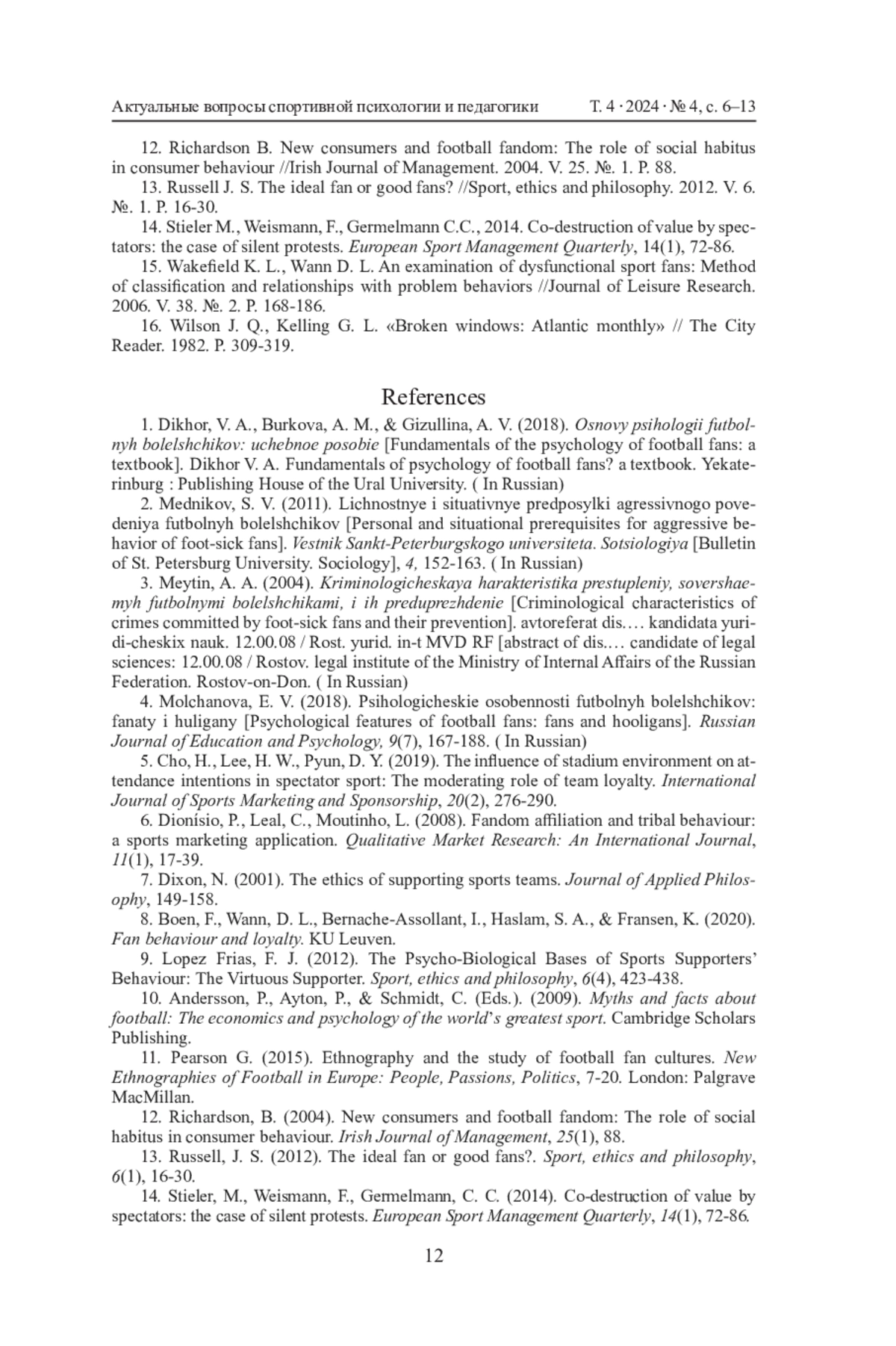 15. Wakefield K. L., Wann D. L. An examination of dysfunctional sport fans: Method of classification and relationships with problem behaviors //Journal of Leisure Research. 2006. V. 38. №. 2. P. 168-186.