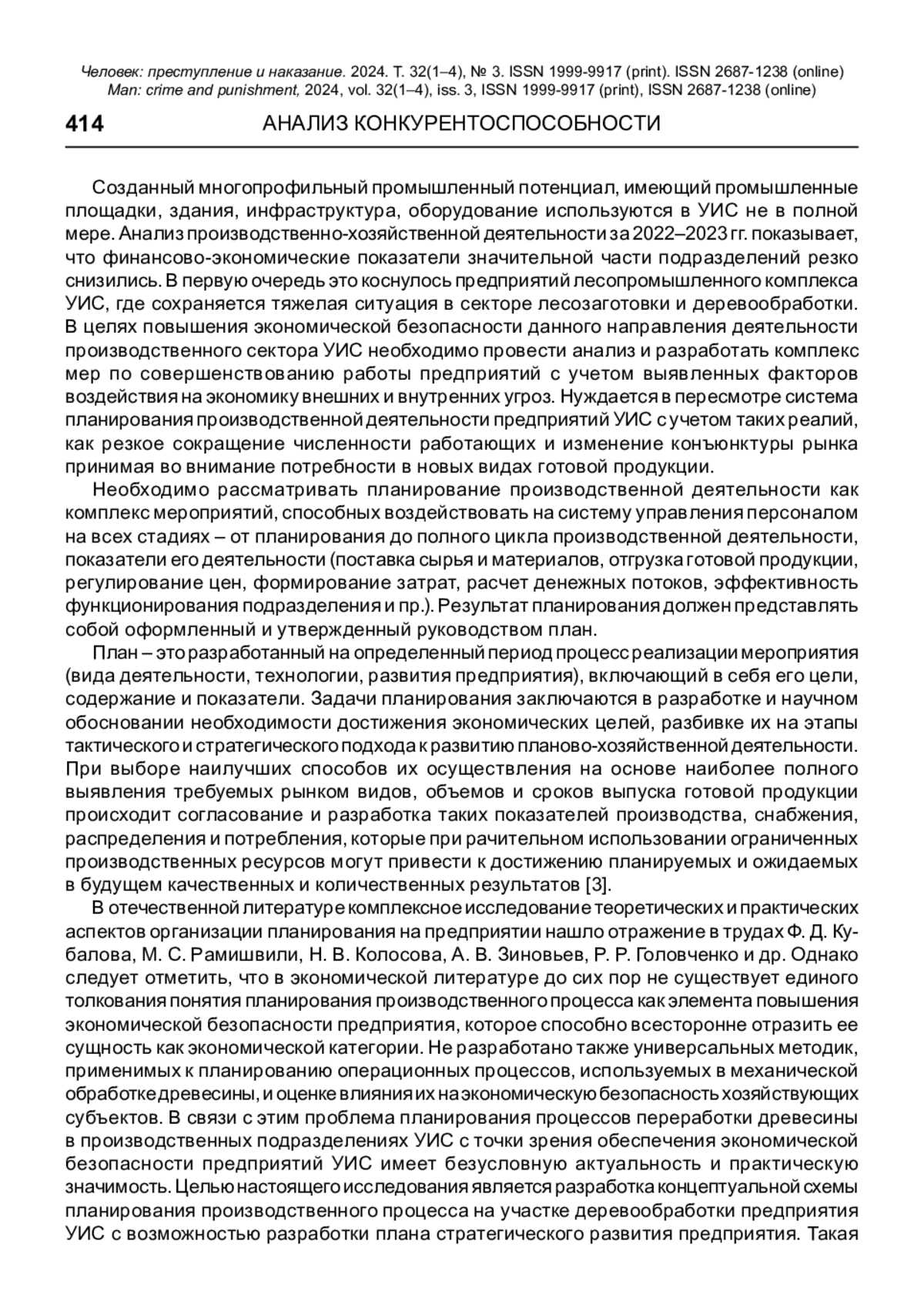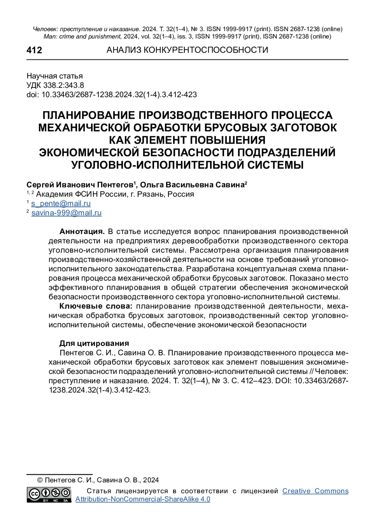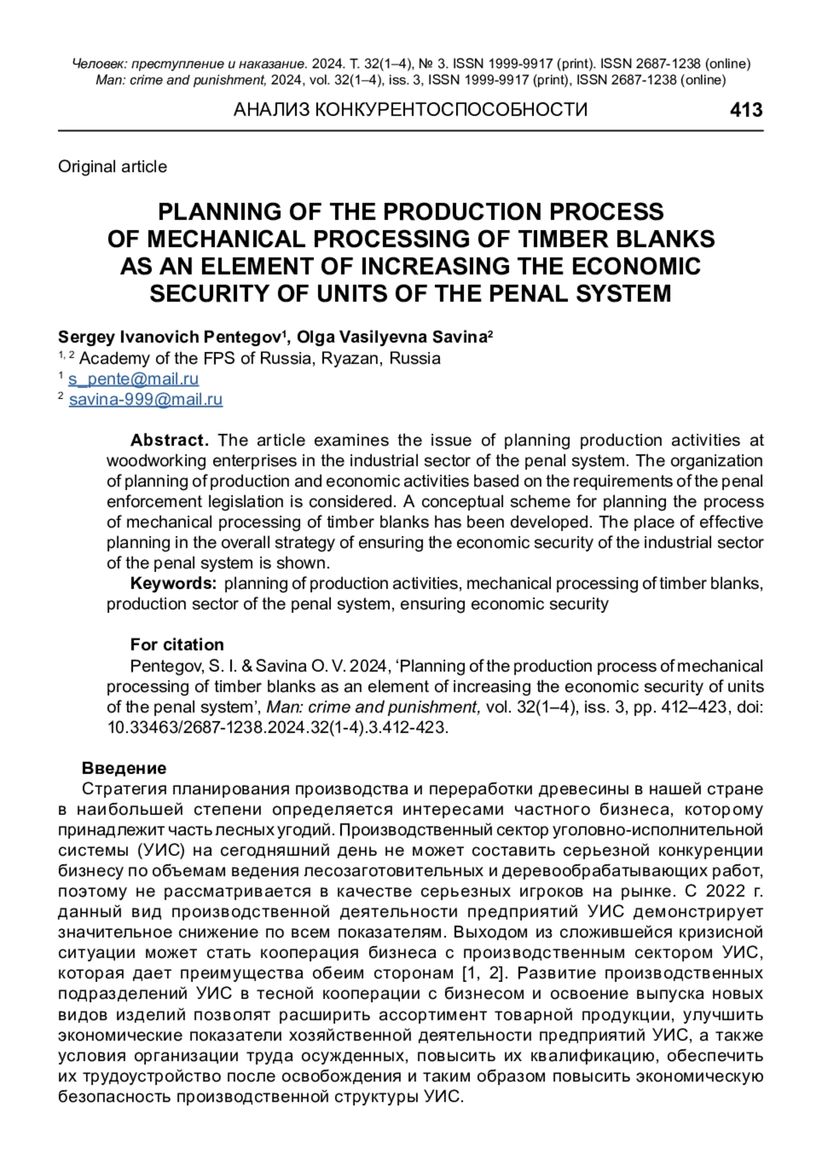 2. Пентегов С. И., Савина О. В. Производство деревянных конструкций на предприятиях переработки древесины как элемент повышения экономической безопасности уголовно-исполнительной системы // Человек: преступление и наказание. 2024. Т. 32(1-4), № 1. С. 92-100. EDN: CKMODZ