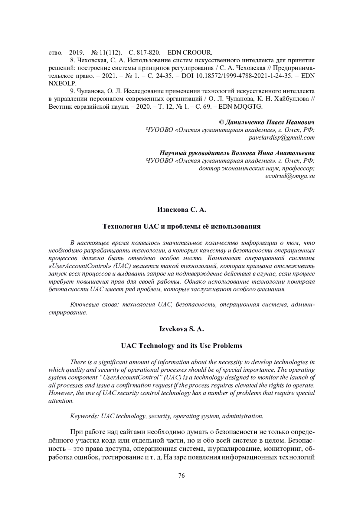 В настоящее время появилось значительное количество информации о том, что необходимо разрабатывать технологии, в которых качеству и безопасности операционных процессов должно быть отведено особое место. Компонент операционной системы «UserAccountControl» (UAC) является такой технологией, которая призвана отслеживать запуск всех процессов и выдавать запрос на подтверждение действия в случае, если процесс требует повышения прав для своей работы. Однако использование технологии контроля безопасности UAC имеет ряд проблем, которые заслуживают особого внимания.