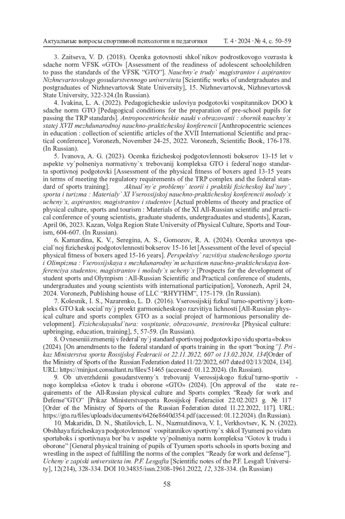 5. Иванова А. Г. Оценка физической подготовленности боксеров 13-15 лет в аспекте выполнения нормативных требований комплекса ГТО и федерального стандарта спортивной подготовки // Актуальные проблемы теории и практики физической культуры, спорта и туризма: Материалы XI Всероссийской научно-практической конференции молодых ученых, аспирантов, магистрантов и студентов с международным участием, прошедшей в рамках Десятилетия науки и технологий: в 3 т., Казань, 06 апреля 2023 года. Казань: Поволжский государственный университет физической культуры, спорта и туризма, 2023. С. 604-607. EDN: CQLETF