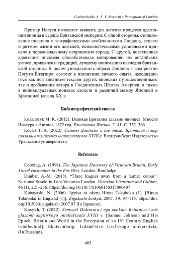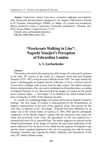 Статья посвящена конструированию образа Лондона и лондонцев начала XX в. в сочинениях японского писателя и поэта Ногути Ёнэдзиро: (1875– 1947), впервые прибывшего в Британию в конце 1902 г. В исследовании используются автобиография писателя на английском языке и сборник «13 лет Британии и США» на бунго с отрывками дневниковых записей. Рассматриваются ключевые характеристики, присущие, по мнению Ногути, городу и его жителям в эдвардианское время. Выявлено, что образы Лондона заданного периода имели общее происхождение – «предобраз» идеализированного города, сформировавшийся на основе воспоминаний японских путешественников 1860–1870-х гг.
