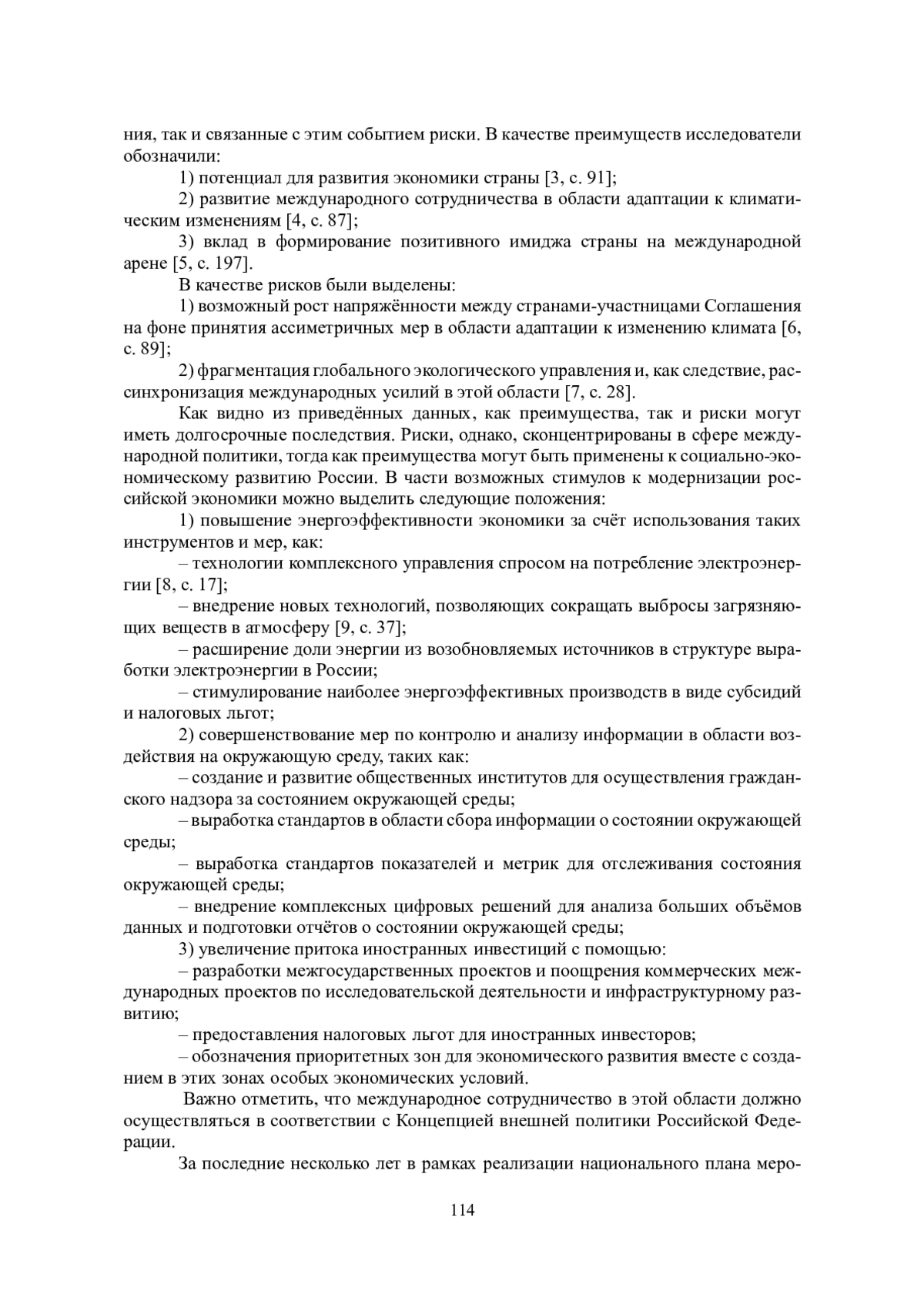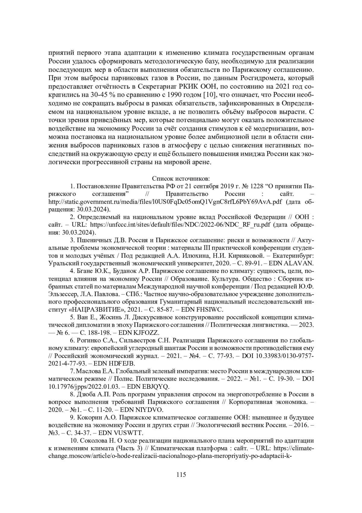 4. Бгане Ю.К., Буданок А.Р. Парижское соглашение по климату: сущность, цели, потенциал влияния на экономику России // Образование. Культура. Общество: Сборник избранных статей по материалам Международной научной конференции / Под редакцией Ю.Ф. Эльзессер, Л.А. Павлова. - СПб.: Частное научно-образовательное учреждение дополнительного профессионального образования Гуманитарный национальный исследовательский институт “НАЦРАЗВИТИЕ”, 2021. - С. 85-87. EDN: FHSIWC