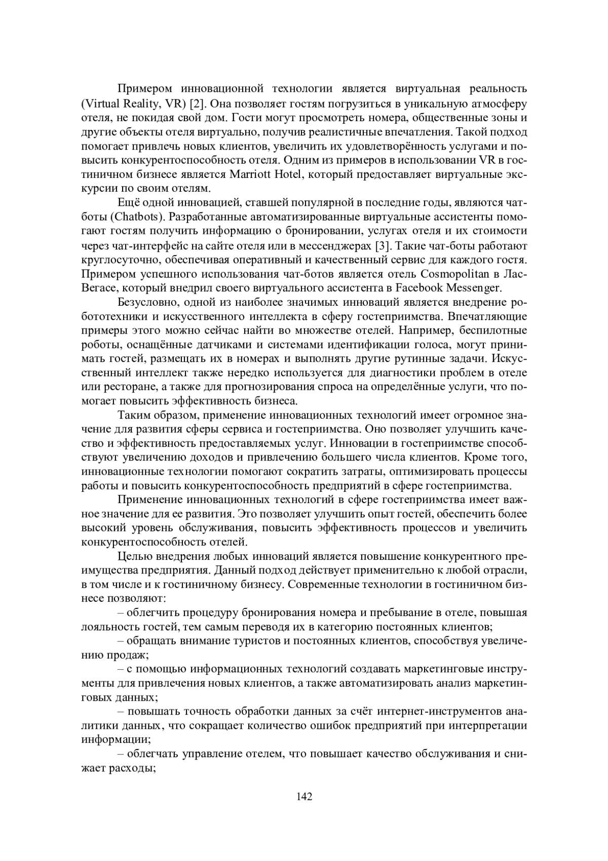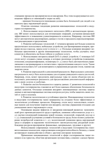 В статье рассмотрена роль и влияние новых технологий на сферу гостеприимства; предложен анализ актуальных инноваций и методов их применения; приведены практические примеры применения различных инноваций, таких как роботизация, искусственный интеллект, интернет вещей и виртуальная реальность. Даны рекомендации по успешному использованию подобных технологий в сфере гостеприимства. В целом исследование представляет собой основу для дальнейшего изучения и применения инновационных технологий в сфере гостеприимства для повышения эффективности и конкурентоспособности отрасли.