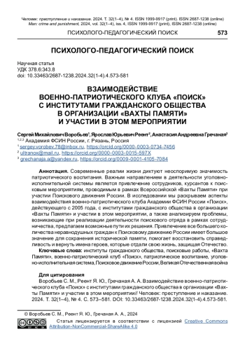Современные реалии жизни диктуют неоспоримую значимость патриотического воспитания. Важным направлением в деятельности уголовно-исполнительной системы является привлечение сотрудников, курсантов к поисковым мероприятиям, проводимым в рамках Всероссийской «Вахты Памяти» при участии Поискового движения России. В исследовании мы раскрываем аспекты взаимодействия военно-патриотического клуба Академии ФСИН России «Поиск», действующего с 2005 года, с институтами гражданского общества в организации«Вахты Памяти» и участии в этом мероприятии, а также анализируем проблемы, возникающие при реализации деятельности поискового отряда в рамках сотрудничества, предлагаем возможные пути их решения. Привлечение все большего количества неравнодушных граждан к Поисковому движению России имеет большое значение для сохранения исторической памяти, помогает восстановить справедливость и вернуть имена героев, которые отдали свою жизнь, защищая Отечество.