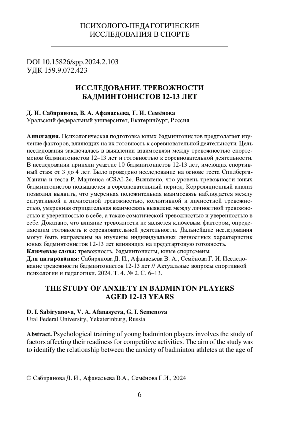 Психологическая подготовка юных бадминтонистов предполагает изучение факторов, влияющих на их готовность к соревновательной деятельности. Цель исследования заключалась в выявлении взаимосвязи между тревожностью спортсменов бадминтонистов 12-13 лет и готовностью к соревновательной деятельности. В исследовании приняли участие 10 бадминтонистов 12-13 лет, имеющих спортивный стаж от 3 до 4 лет. Было проведено исследование на основе теста Спилберга-Ханина и теста Р. Мартенса «CSAI-2». Выявлено, что уровень тревожности юных бадминтонистов повышается в соревновательный период. Корреляционный анализ позволил выявить, что умеренная положительная взаимосвязь наблюдается между ситуативной и личностной тревожностью, когнитивной и личностной тревожностью, умеренная отрицательная взаимосвязь выявлена между личностной тревожностью и уверенностью в себе, а также соматической тревожностью и уверенностью в себе. Доказано, что влияние тревожности не является ключевым фактором, определяющим готовность к соревновательной деятельности. Дальнейшие исследования могут быть направлены на изучение индивидуальных личностных характеристик юных бадминтонистов 12-13 лет влияющих на предстартовую готовность.