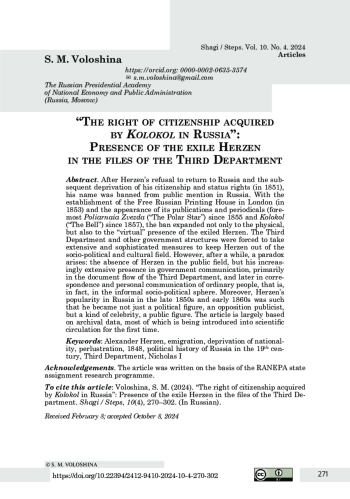 После отказа Герцена возвратиться в Россию и последовавшего за этим в 1851 г. лишения его российского подданства его имя становится запрещенным для публичного упоминания в России. Позже, с появлением изданий Вольной русской типографии в Лондоне (1853), запрет расширяется не только на физическое, но и «виртуальное» присутствие изгнанника Герцена в России. III отделение и некоторые другие властные структуры вынуждены были предпринимать все более масштабные и изощренные меры для «недопущения» Герцена в социальнополитическое и культурное поле. Однако через некоторое время возникает парадокс: отсутствие Герцена в публичном поле, но все более обширное присутствие во властной коммуникации, прежде всего в документообороте III отделения, а позже — в переписке и личном общении обычных подданных, т. е. в неофициальной социально-политической сфере. Более того, популярность Герцена в России в конце 1850-х — начале 1860-х была такова, что он стал не просто политической фигурой, оппозиционным публицистом, но своего рода знаменитостью. Материалом для статьи послужили архивные источники, большая часть которых впервые вводится в научный оборот.