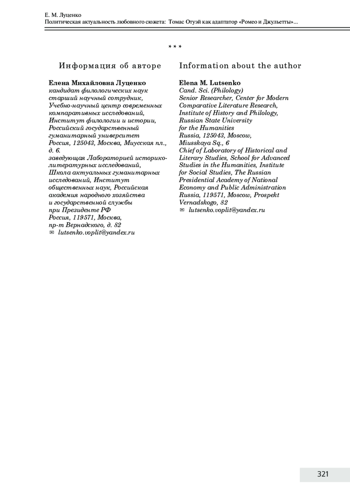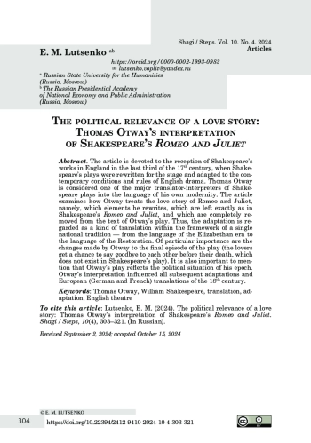 Статья посвящена рецепции шекспировского творчества в Англии последней трети XVII в., когда шекспировские тексты активно переписываются для сцены, будучи адаптированными к современному состоянию английской драматургии. Томас Отуэй известен как один из главных перелагателей Шекспира на язык современности. В статье рассматривается, как Отуэй трактует любовную линию «Ромео и Джульетты», а именно то, какие элементы Отуэй переписывает, какие оставляет в точности как у Шекспира, а какие полностью убирает из шекспировского текста. Таким образом, адаптация представляет собой своего рода перевод текста, но в рамках одной национальной традиции — с языка елизаветинского периода на язык эпохи Реставрации. Особое значение в рамках подобной трансформации приобретают изменения, внесенные Отуэем в финал пьесы (влюбленные прощаются перед смертью, чего нет у Шекспира). Важно и то, что в пьесе Отуэя отчетливо проступает политическая ситуация его эпохи. Трактовка Отуэя повлияла на все последующие адаптации и европейские (немецкие и французские) переводы-переложения XVIII в.