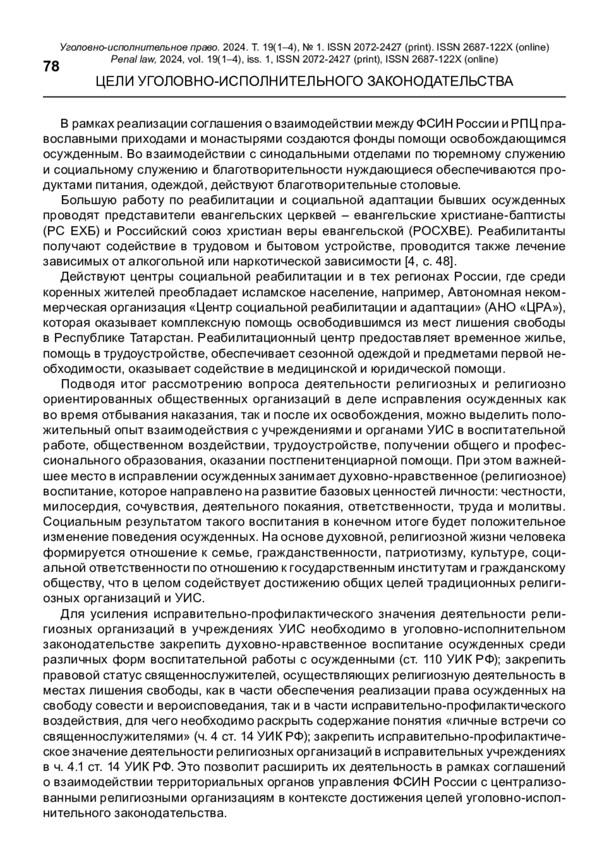 Исследование посвящено вопросам деятельности религиозных организаций в учреждениях уголовно-исполнительной системы России. В статье выявляются тенденции изменения уголовно-исполнительного законодательства в сфере укрепления традиционных духовно-нравственных ценностей в уголовно-исполнительной политике Российской Федерации. Рассматриваются социальные концепции традиционных в России религиозных организаций в части оказания помощи осужденным, а также направления и формы участия священнослужителей, религиозных и некоммерческих организаций в реализации основных средств исправления осужденных. Особое внимание уделяется изучению роли религиозных организаций, а также религиозно ориентированных некоммерческих организаций в содействии ресоциализации и социальной адаптации осужденных. Внесены предложения по развитию средств правового регулирования и правоприменительной практики в области взаимодействия учреждений и органов уголовно-исполнительной системы с традиционными в России централизованными религиозными организациями.
