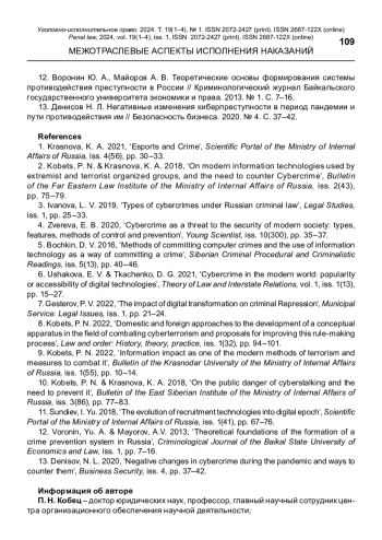 2. Кобец П. Н., Краснова К. А. О современных информационных технологиях, используемых экстремистскими и террористическими организованными группами, и необходимости противодействия киберпреступности // Вестник Дальневосточного юридического института МВД России. 2018. № 2(43). С. 75-79. EDN: XRECPB