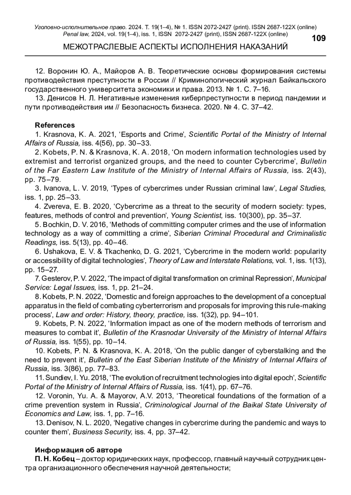 Статья посвящена исследованию детерминант киберпреступности в России и мер противодействия ей. Раскрываются количественные и качественные характеристики киберпреступлений. Выявляются особенности личности преступника и виктимилогические риски граждан в цифровой среде. Авторы приходят к выводу о решающем значении мер профилактики в борьбе с киберпреступностью и необходимости совершенствования законодательства в рассматриваемой сфере.
