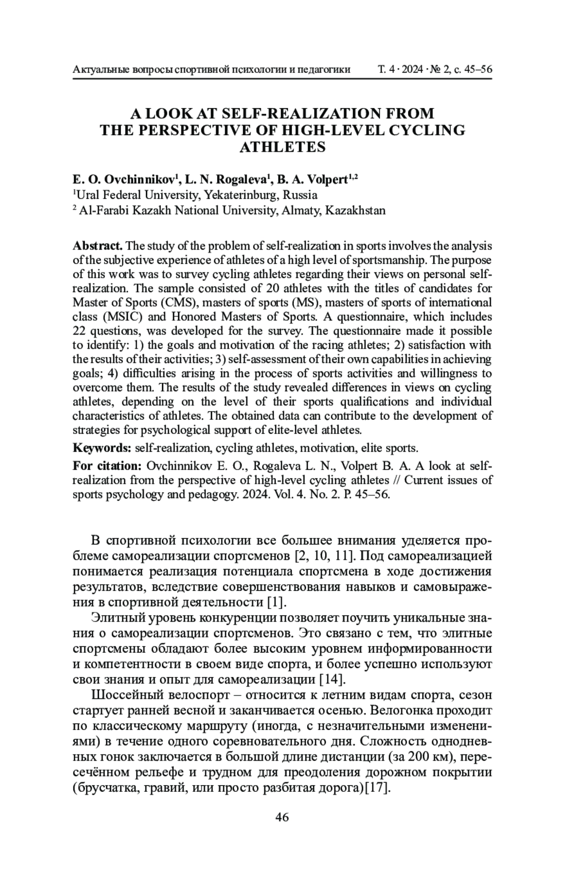 Изучение проблемы самореализации в спорте предполагает анализ субъективного опыта спортсменов высокого уровня спортивного мастерства. Цель данной работы заключалась в опросе спортсменов-велошоссейников относительно их взглядов на личностную самореализацию. Выборку составили 20 спортсменов, имеющих звания кандидатов в мастера спорта (КМС), мастеров спорта (ММС), мастеров спорта международного класса (МСМК) и заслуженные мастера спорта (ЗМС). Для опроса была разработана анкета, включающая 22 вопроса. Анкета позволяла выявить: 1) цели и мотивацию спортсменов гонщиков; 2) удовлетворенность результатами деятельности; 3) самооценку собственных возможностей в достижении целей; 4) трудности, возникающие в процессе спортивной деятельности и готовность к их преодолению. Результаты исследования выявили различия во взглядах на спортсменов-велошоссейников в зависимости от уровня их спортивной квалификации и индивидуальных особенностей спортсменов. Полученные данные могут способствовать разработке стратегий психологического сопровождения спортсменов элитного уровня.