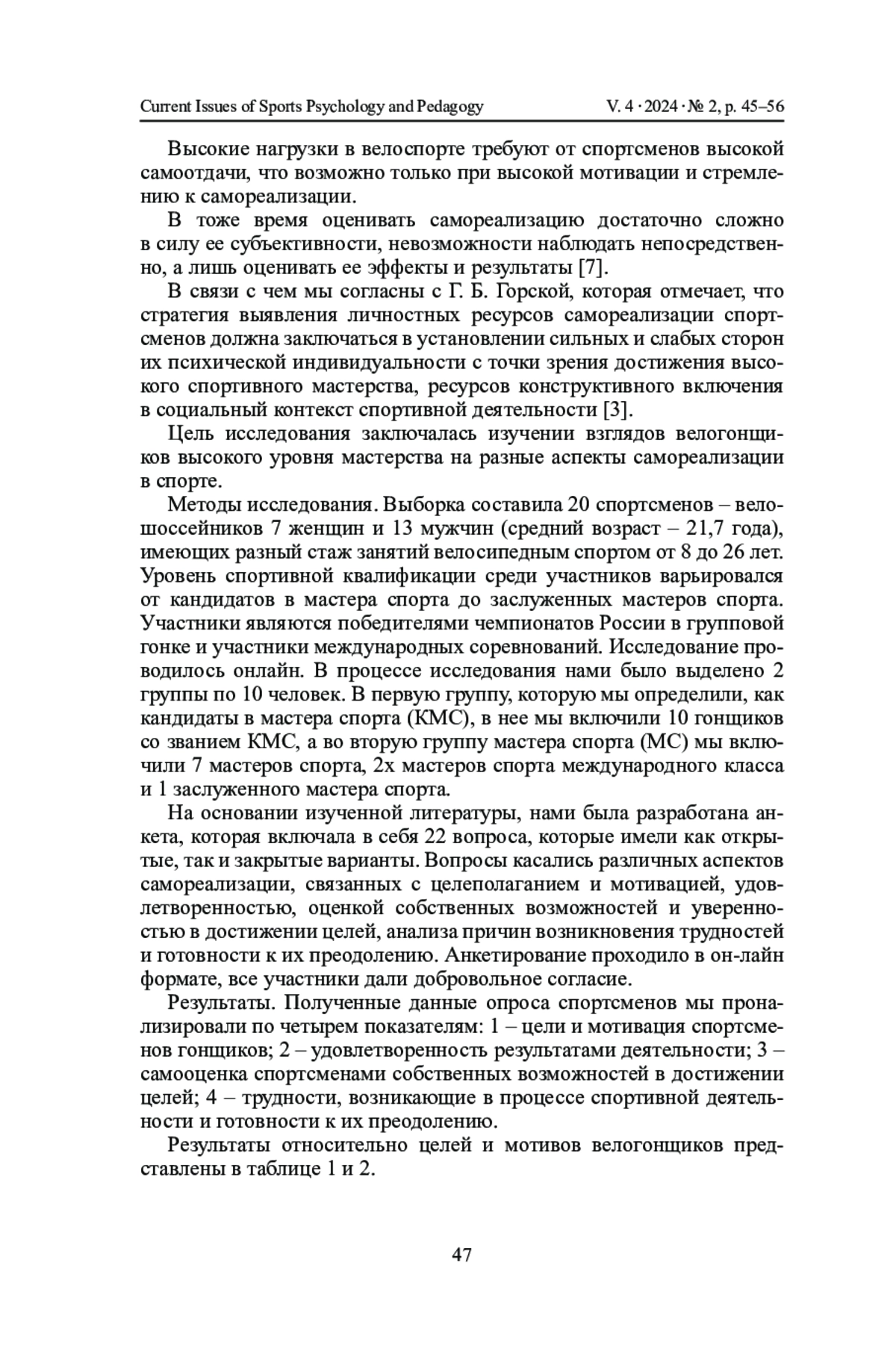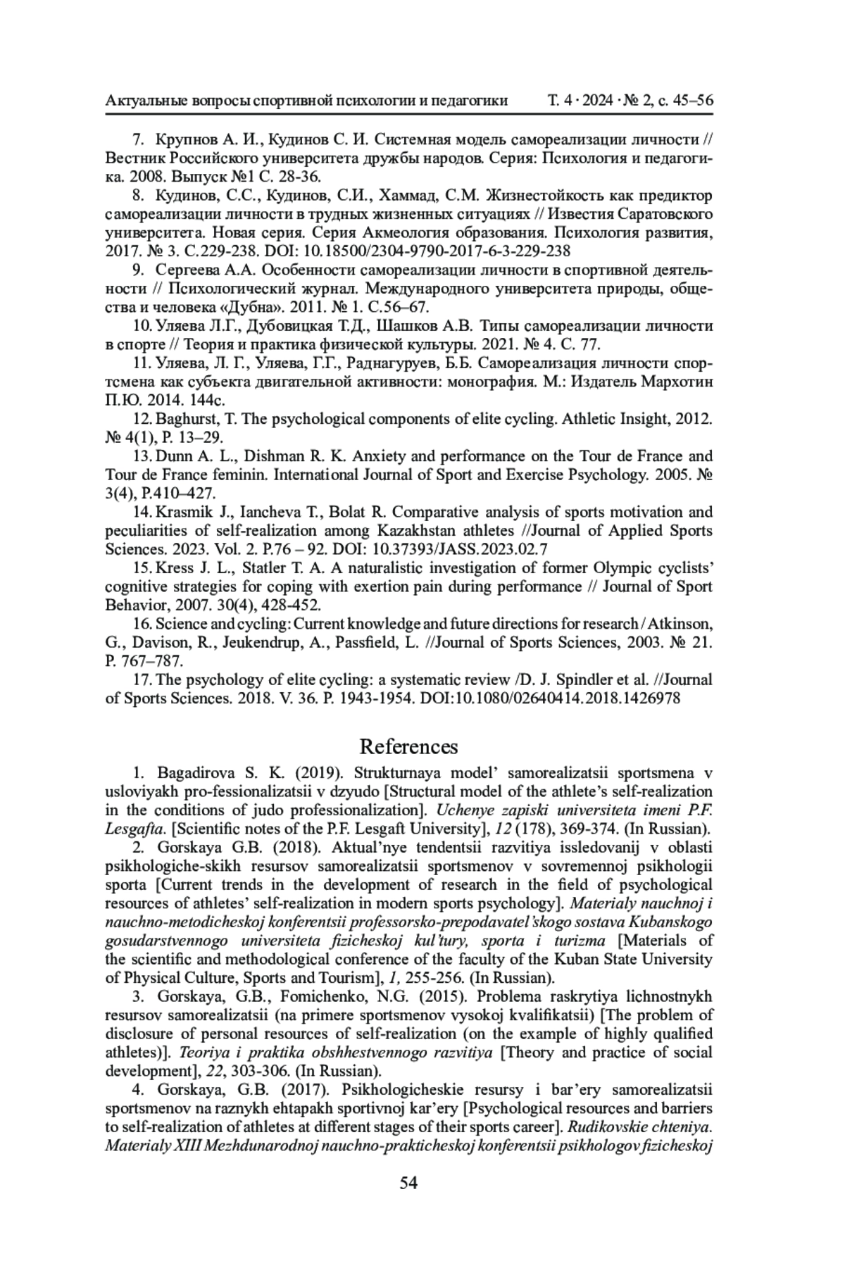 2. Горская Г. Б. Актуальные тенденции развития исследований в области психологических ресурсов самореализации спортсменов в современной психологии спорта //Материалы научной и научно-методической конференции профессорско-преподавательского состава Кубанского государственного университета физической культуры, спорта и туризма. 2018. № 1. С. 255-256. EDN: UVOMFG