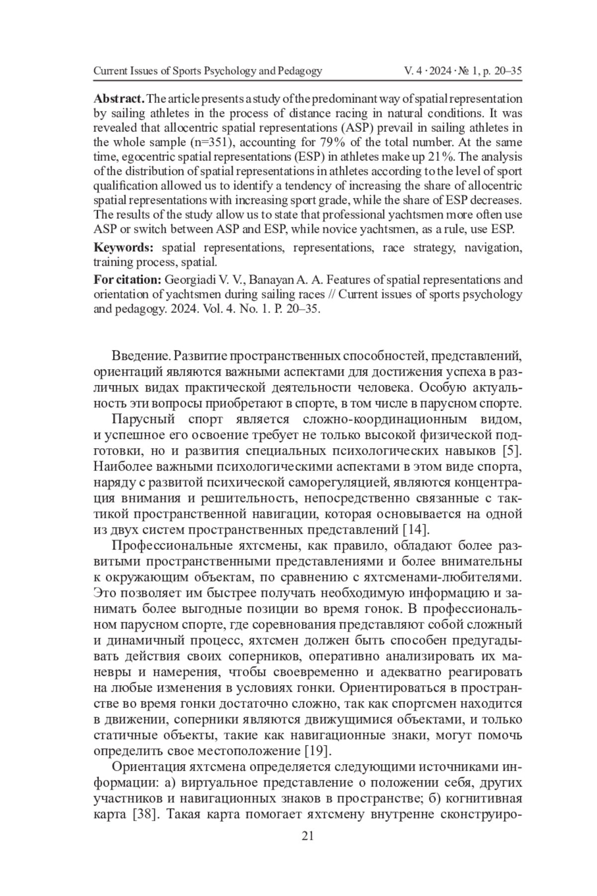 В статье представлено исследование преобладающего способа пространственного представления спортсменами парусного спорта в процессе гонок на дистанции в естественных условиях. Выявлено, что у спортсменов парусного спорта в целом по выборке (n=351) преобладают аллоцентрические пространственные представления (АПП), составляющие 79 % от общего числа. В то же время эгоцентрические пространственные представления (ЭПП) у спортсменов составляют 21 %. Анализ распределения пространственных представлений у спортсменов по уровню спортивной квалификации позволил выделить тенденцию увеличения доли аллоцентрических пространственных представлений с повышением спортивного разряда, в то время как доля ЭПП снижается. Результаты проведенного исследования позволяют констатировать, что профессиональные яхтсмены чаще используют АПП или переключение между ЭПП и АПП, в то время как начинающие яхтсмены, как правило, используют только ЭПП.