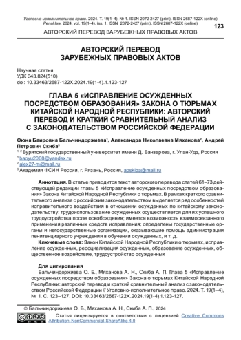 В статье приводится текст авторского перевода ст. 61–73 действующей редакции гл. 5 «Исправление осужденных посредством образования» Закона о тюрьмах Китайской Народной Республики. Выделим некоторые отличия положений Закона Китайской Народной Республики о тюрьмах (далее – Закон КНР о тюрьмах) от российского законодательства (с учетом ст. 9, 103, 109, 110, 112 Уголовно-исполнительного кодекса Российской Федерации).