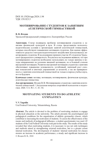 Статья посвящена проблеме мотивирования студентов к занятиям физической культурой в вузе. В статье представлены психолого-педагогические условия к организации занятий атлетической гимнастикой, которые способствуют повышению мотивации студентов. Для оценки эффективности средств и методов педагогического воздействия использовалось анкетирование студентов. В исследовании приняли участие 45 студентов Уральского федерального университета. Результаты исследования выявили, что при мотивировании студентов необходимо использовать не только приемы и методы направленные на усиление внешней мотивации, но в большей степени внутренней мотивации. Развитие внутренней мотивации студентов к занятиям обеспечивает повышение успеваемости, устойчивый, значимый рост силовых показателей в зачетных упражнениях со штангой, а так же приверженность к занятиям атлетической гимнастикой не только в период учебы в вузе, но и в будущем.