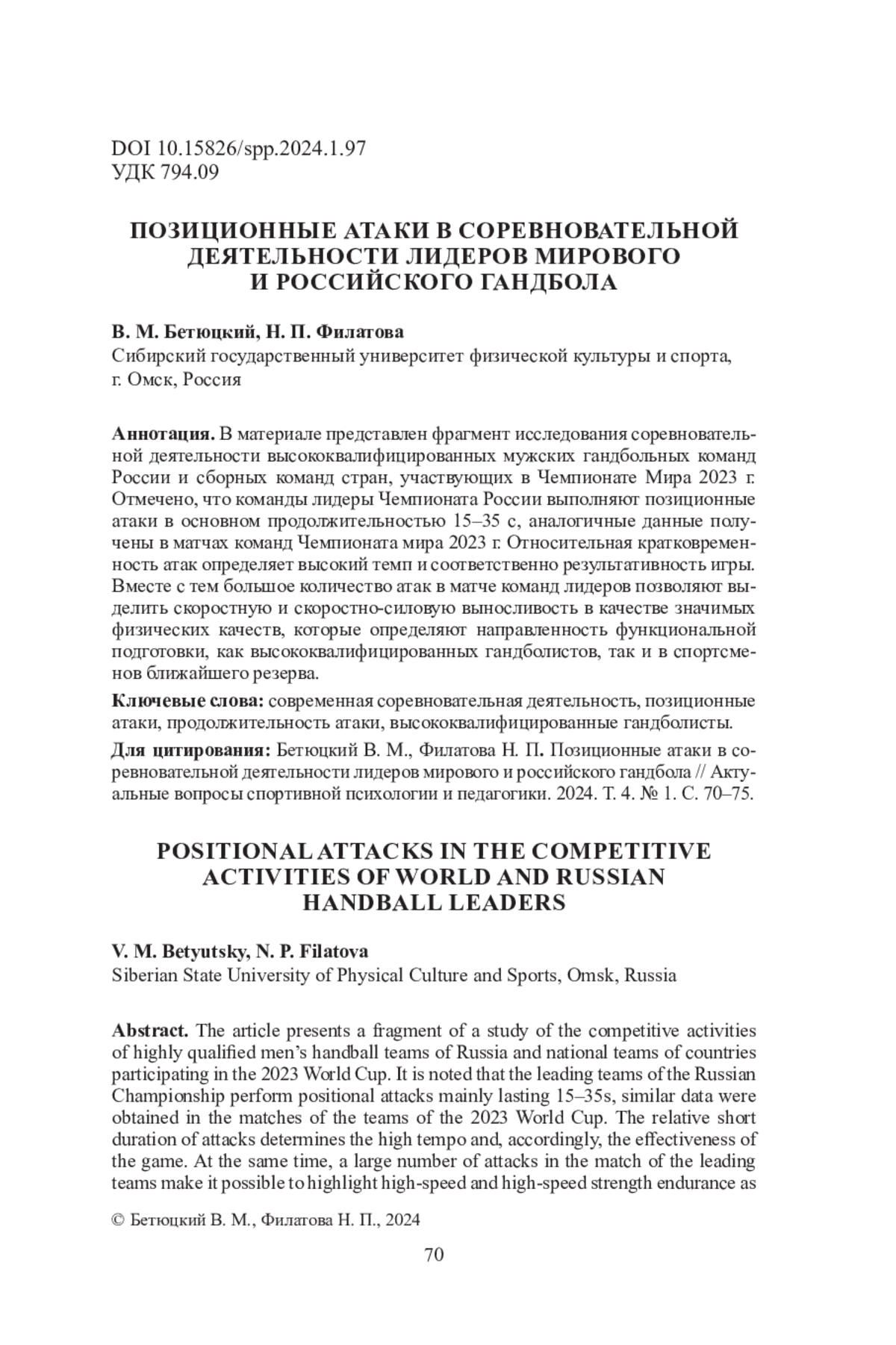1. Бетюцкий В. М. Продолжительность атак позиционным нападением в игровой деятельности высококвалифицированных гандбольных мужских команд // Вестник Сибирского государственного университета физической культуры и спорта. 2023. № 3. С. 11-14. EDN: PBAUNR