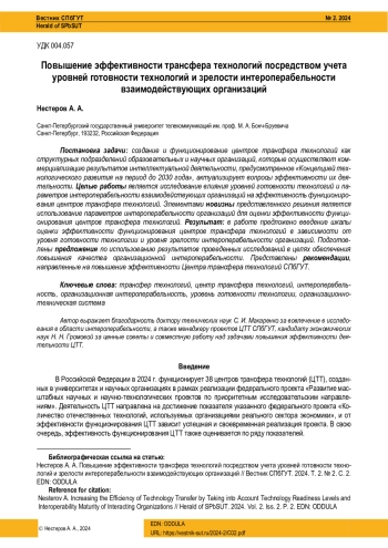 НЕСТЕРОВ А. А. ПОВЫШЕНИЕ ЭФФЕКТИВНОСТИ ТРАНСФЕРА ТЕХНОЛОГИЙ ПОСРЕДСТВОМ УЧЕТА УРОВНЕЙ ГОТОВНОСТИ ТЕХНОЛОГИЙ И ЗРЕЛОСТИ ИНТЕРОПЕРАБЕЛЬНОСТИ ВЗАИМОДЕЙСТВУЮЩИХ ОРГАНИЗАЦИЙ // ВЕСТНИК СПБГУТ. 2024. ТОМ 2, № 2