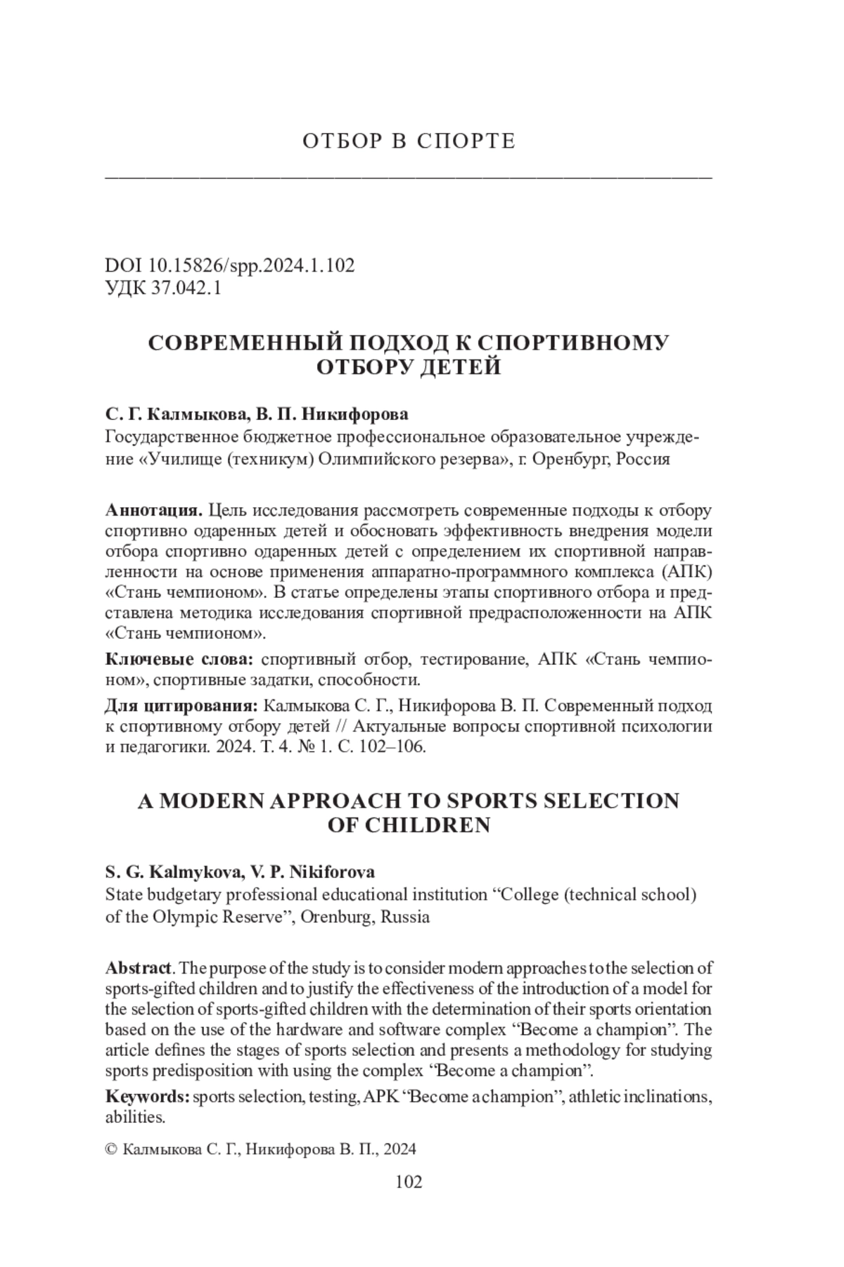 Цель исследования рассмотреть современные подходы к отбору спортивно одаренных детей и обосновать эффективность внедрения модели отбора спортивно одаренных детей с определением их спортивной направленности на основе применения аппаратно-программного комплекса (АПК) «Стань чемпионом». В статье определены этапы спортивного отбора и представлена методика исследования спортивной предрасположенности на АПК «Стань чемпионом».