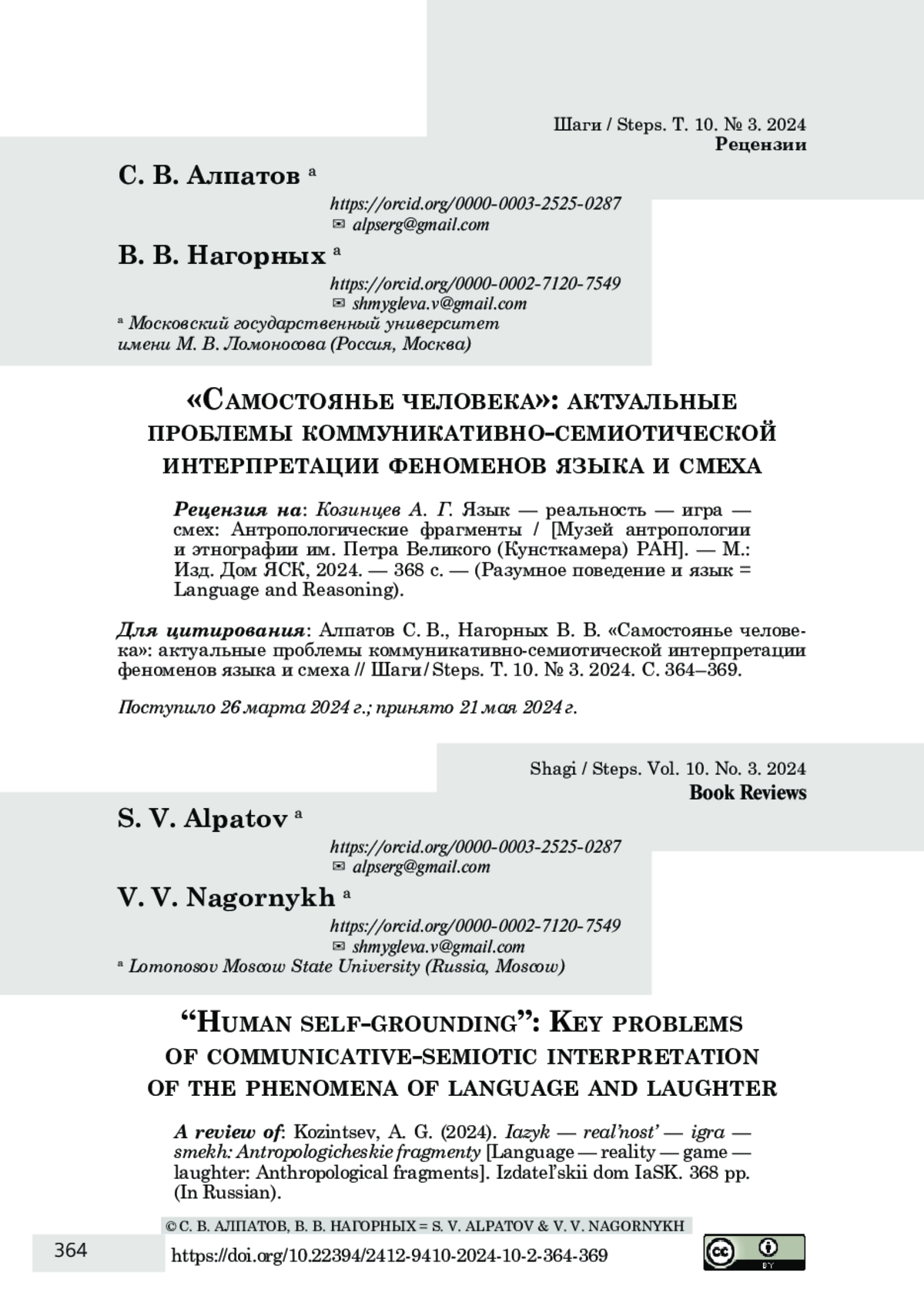 Рецензия на: Козинцев А. Г. Язык — реальность — игра — смех: Антропологические фрагменты / [Музей антропологии и этнографии им. Петра Великого (Кунсткамера) РАН]. — М.: Изд. Дом ЯСК, 2024. — 368 с. — (Разумное поведение и язык = Language and Reasoning).