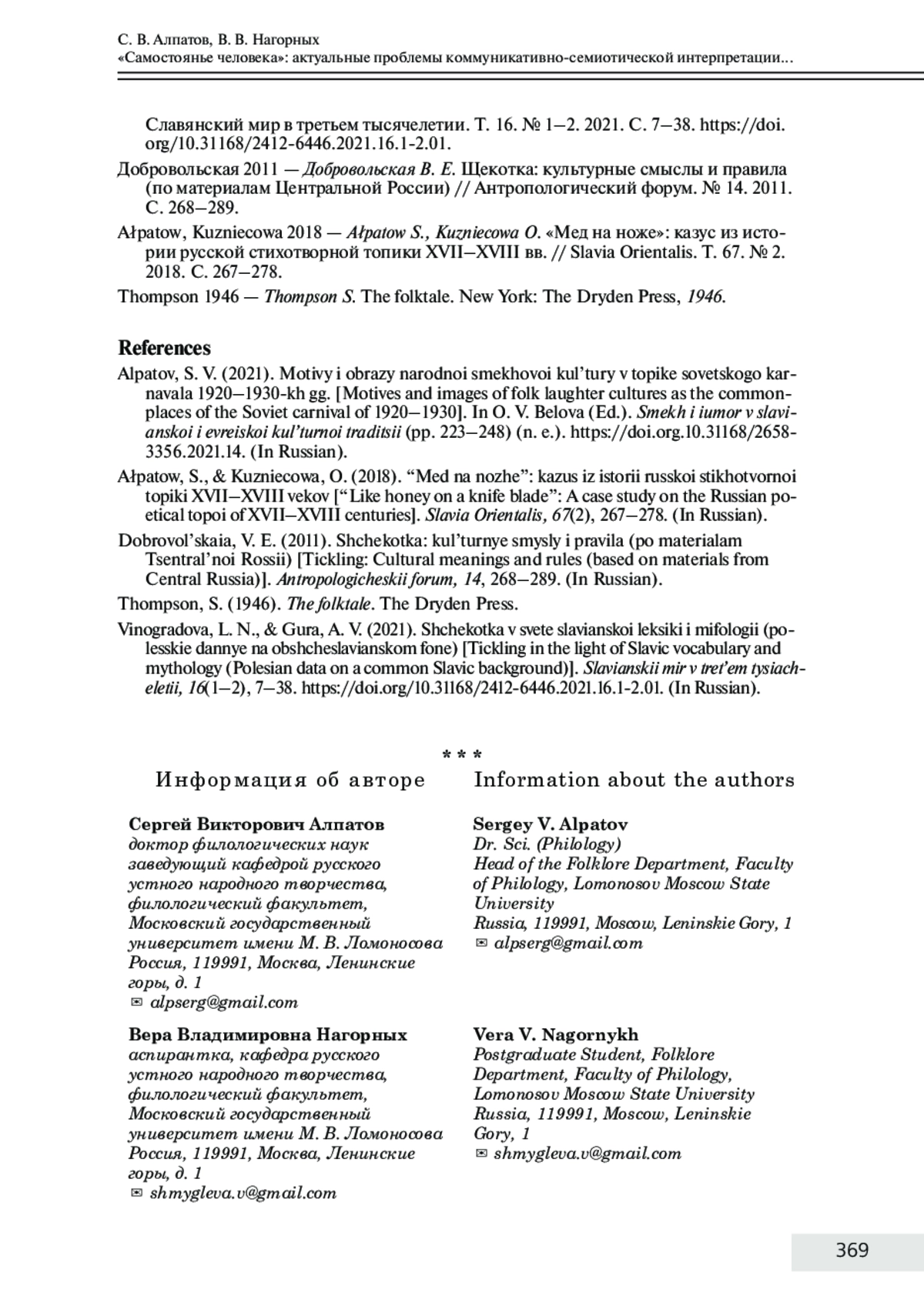 1. Алпатов 2021 - Алпатов С. В. Мотивы и образы народной смеховой культуры в топике советского карнавала 1920-1930-х гг. // Смех и юмор в славянской и еврейской культурной традиции / Отв. ред. О. В. Белова. М.: [б. и.], 2021. С. 223-248. https://doi.org/https://doi.org.10.31168/2658-3356.2021.14.