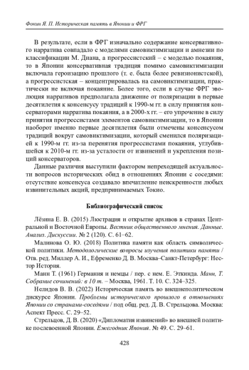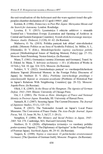 20. Nelidov, V. V. (2022). Istoricheskaya pamyat’ vo vneshnepoliticheskom diskurse Yaponii [Historical Memory in the Foreign Policy Discourse of Japan]. In: Streltsov D. V. (Ed.), Problemy istoricheskogo proshlogo v otnosheniyakh Yaponii so stranami-sosedyami [Problems of Historical Past in Japan’s Relations With Neighboring Countries] (pp. 29-52). Moscow: Aspekt-Press. (In Russian).