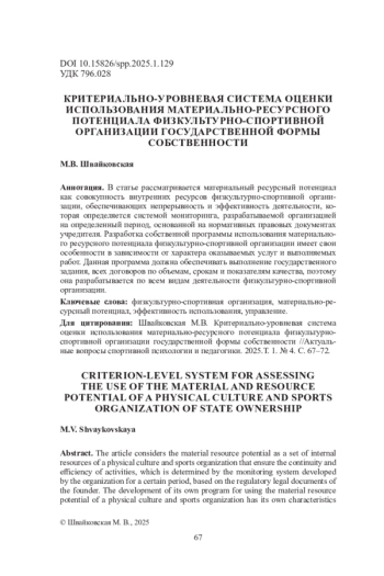 Анализ эффективности использования материально-ресурсного потенциала и оценка уровня обеспеченности материальными ресурсами физкультурно-спортивных организаций является достаточно актуальной проблемой в настоящее время.