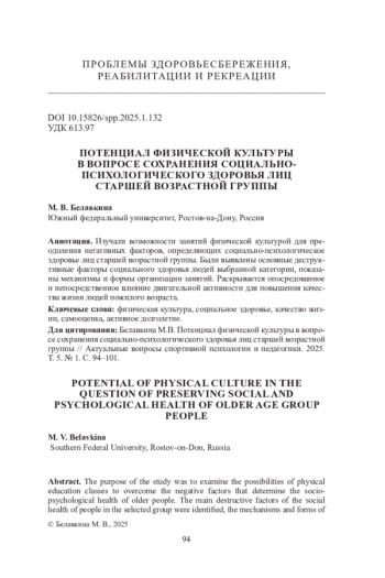 Изучали возможности занятий физической культурой для преодоления негативных факторов, определяющих социально-психологическое здоровье лиц старшей возрастной группы. Были выявлены основные деструктивные факторы социального здоровья людей выбранной категории, показаны механизмы и формы организации занятий. Раскрывается опосредованное и непосредственное влияние двигательной активности для повышения качества жизни людей пожилого возраста.